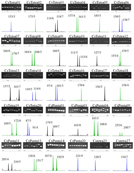 PCR amplification [26] was performed using a 10 µL reaction system: 2.7 µL of double-distilled water; 5 µL of 2× Accuproof HiFi HotStart SuperMix; 0.4 µL of Primer-F (concentration 10 µmol); 0.4 µL of Primer-R (concentration 10 µmol); and 1.5 µL of DNA template (concentration 30 ng/µL). The PCR amplification reaction program was as follows: Step 1: Pre-denaturation at 94 °C for 4 min; Step 2: Denaturation at 94 °C for 30 s; Step 3: Annealing at 56 °C for 30 s; Step 4: Extension at 72 °C for 40 s; Step 5: Repeat Steps 2–4 for a total of 35 cycles; and Step 6: Final extension at 72 °C for 10 min; hold the products at 4 °C. The amplified products were analyzed using 7% polyacrylamide gel electrophoresis (PAGE) at 120 V for 90 min. After electrophoresis, the gel was stained in 0.01% nucleic acid dye for 15 min, followed by visualization and image capture for documentation. Primer pairs that yield clear target amplification products and exhibit high polymorphism are selected for further analysis. The selected markers are named in the following manner: starts with “Cs” (Camellia sinensis), followed by “Tetra” or “Penta”, and a two-digit number; for example, CsTetra01. Among them, CsPenta01, CsPenta03, and CsPenta04 are from Tan et al. [27].