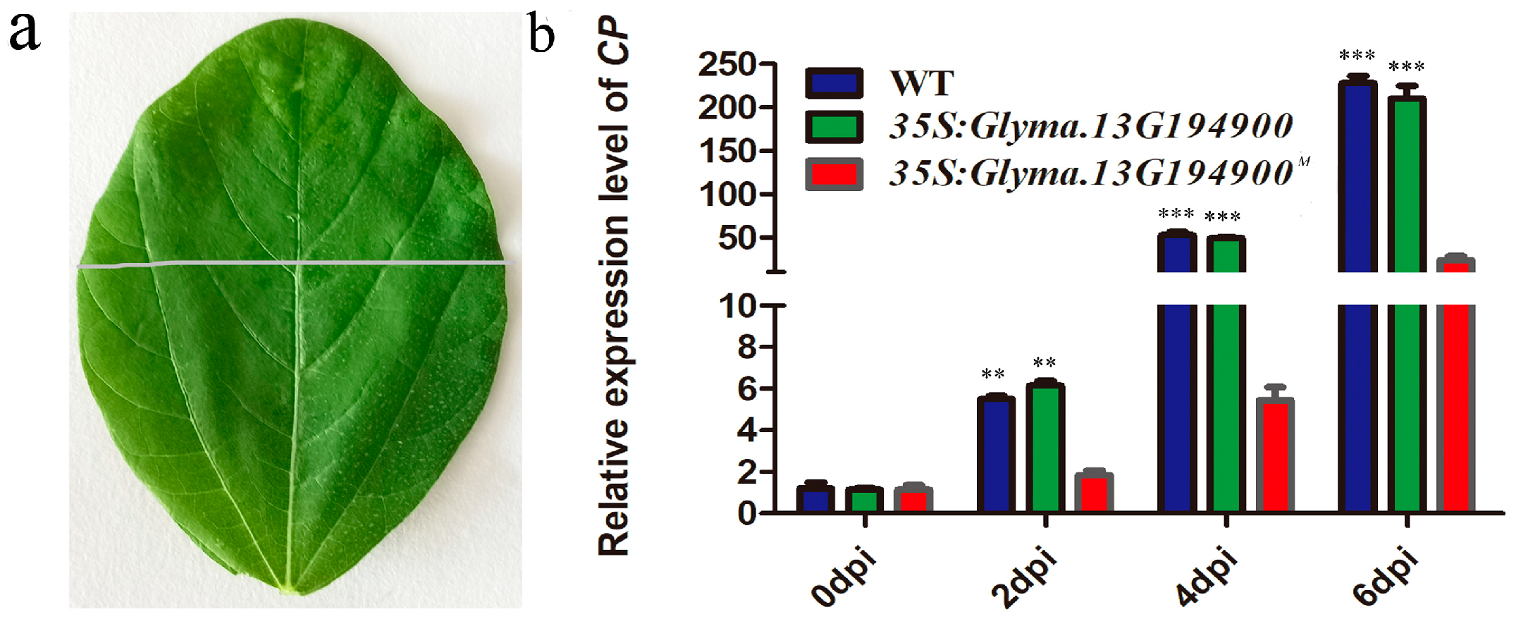 2.5. Overexpression of Glyma.13G194900M Inhibits Viral Replication and/or Cell-to-Cell Movement