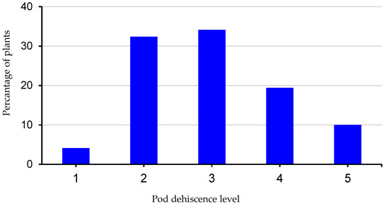 Pod dehiscence (PD), or pod shattering, in wild soybean or landraces is an important trait for plant populations in natural environments [7,8]. In domesticated crops, PD is an entirely unfavourable trait due to the detrimental impact it has on seed yield during harvest [9]. Therefore, the production of genotypes with no or minimal PD is strongly emphasised in all soybean breeding programs. Resistance to PD is a complex of physical, physiological and biochemical processes [10], and is associated with the pod-related traits: pod length, width and thickness as well as ratios, including length/width, length/thickness and width/thickness. Usually, PD occurs when pods reach the stage of physiological maturity. One of the reasons relates to decreased humidity in pod walls and reduced relative water content in the pod [11,12,13,14,15]. However, there are few investigated cases of pod opening, which occurs when the pods are still immature and green. Water deficit can be a trigger to immature pod opening in soybean, as reported in experiments in greenhouse conditions studying the effect of drought on plants during pod formation [16].