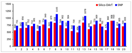 DArTseq analysis yielded a total of 59,850 molecular markers including 18,540 Silico-DArT and 41,310 DArT-SNPs. After quality control, 13,765 Silico-DArT and 16,914 DArT-SNP markers remained for further research. The distribution of molecular markers across soybean chromosomes was illustrated in Figure 5, ranging nearly from 500 to 900 for Silico-DArT and from 700 to 1100 for SNPs. All remaining markers had an average read depth of 19, reproducibility of 0.995, and a call rate of 0.96