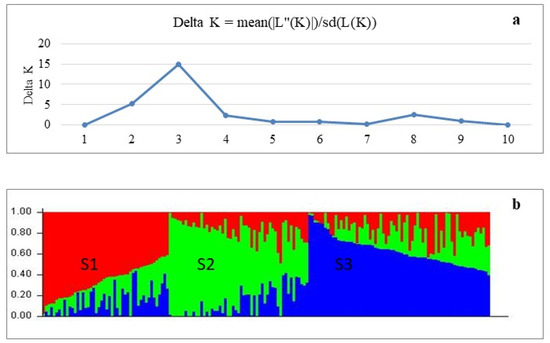 Population structure analysis of studied soybean accessions. (a) Delta K values for different numbers of populations assumed (K) in the STRUCTURE analysis. (b) Classification of soybean accessions into three sub-populations (K = 3) using STRUCTURE 2.3.3. The distribution of the accessions to different populations is indicated by the colour code. Numbers on the Y-axis show subgroup membership, whereas the X-axis shows the distribution of 170 studied soybean genotypes.