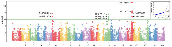 Manhattan plot of association mapping conducted using GLM. X-axis represents chromosome positions, Y-axis represents log10 (p-values). The green line in the Manhattan plot indicates the threshold (p-value < 1 × 10−6). The dots with numbers located above the threshold line represents QTLs that were significantly associated with PD. The Q-Q plot for the GLM model is located in the top-right corner.