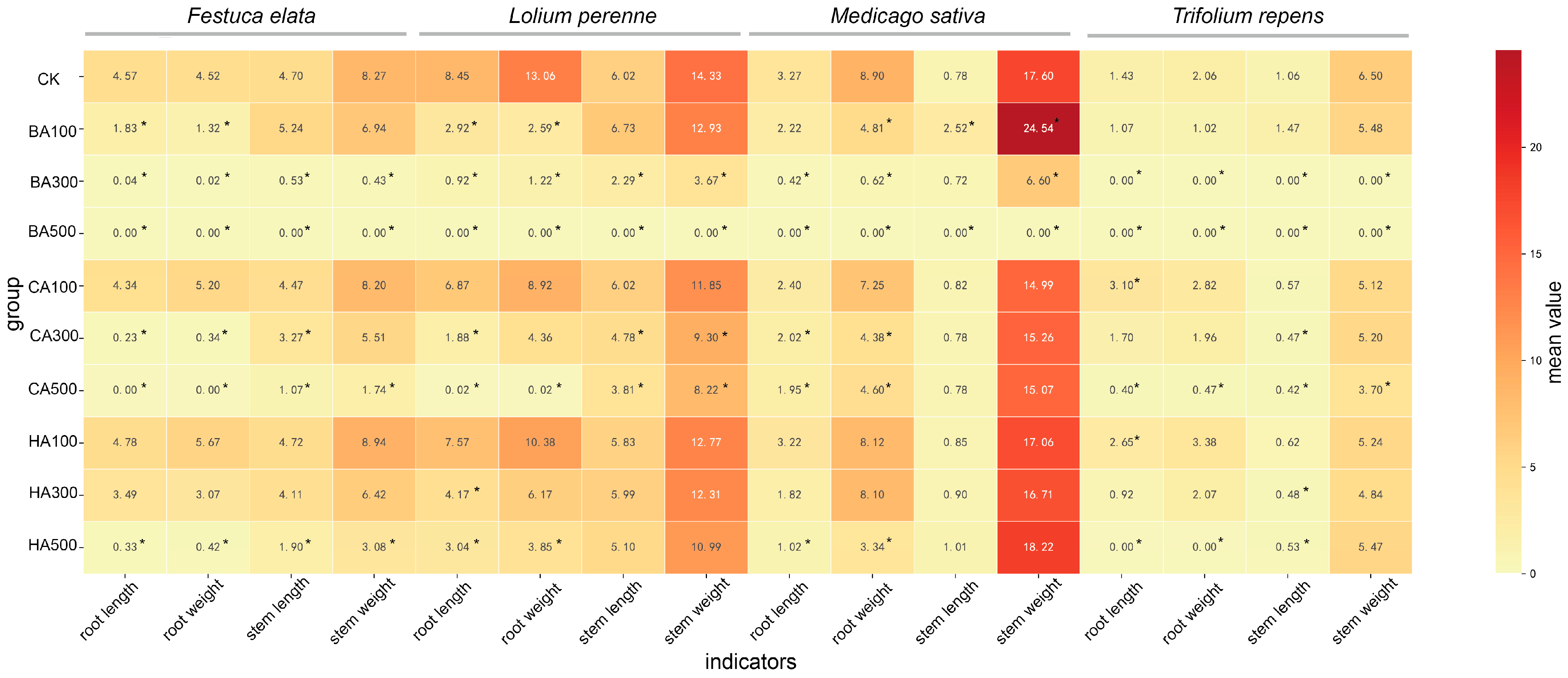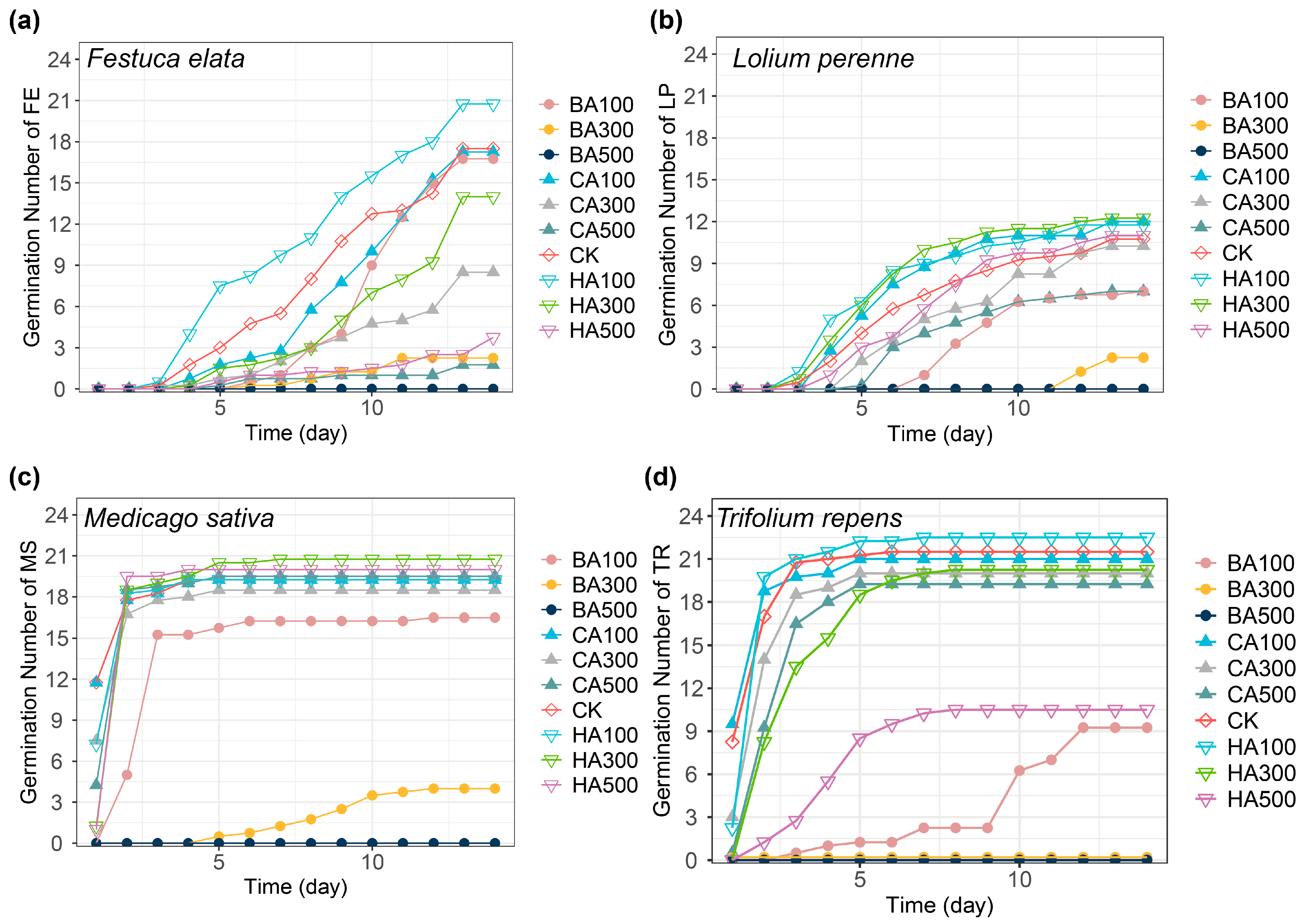 - Wang, H.; Ma, X.; Lin, R.; Zhang, Y.; Ren, J.; Dai, H. Allelopathic Effects of Ligularia cymbulifera Extracts on Seed Germination and Seedling Growth of Three Forages. Acta Agrestia Sin. 2022, 30, 93–99. [Google Scholar] [CrossRef]