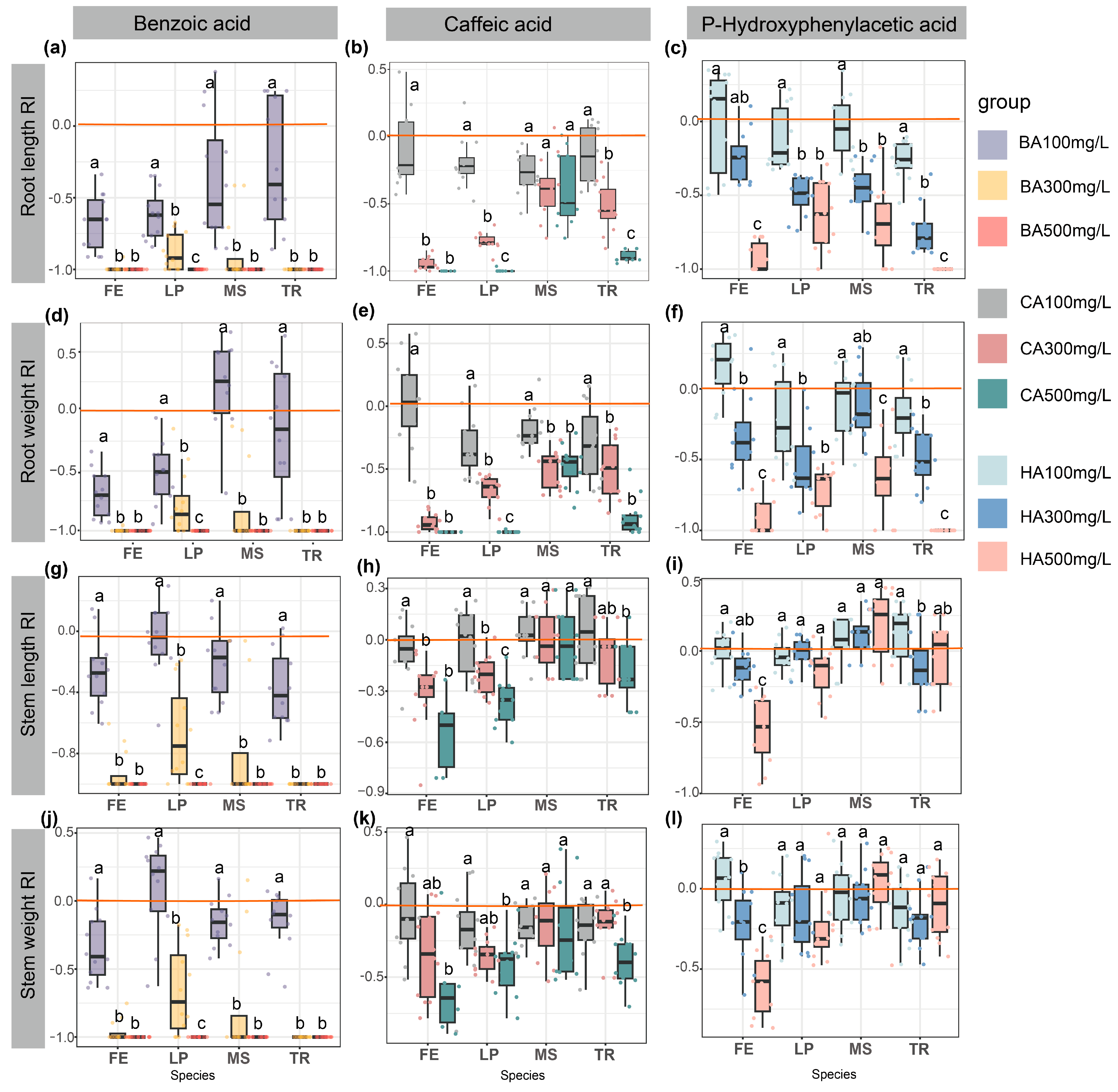 3.2. Plant-Specific Sensitivity to Different Allelochemicals