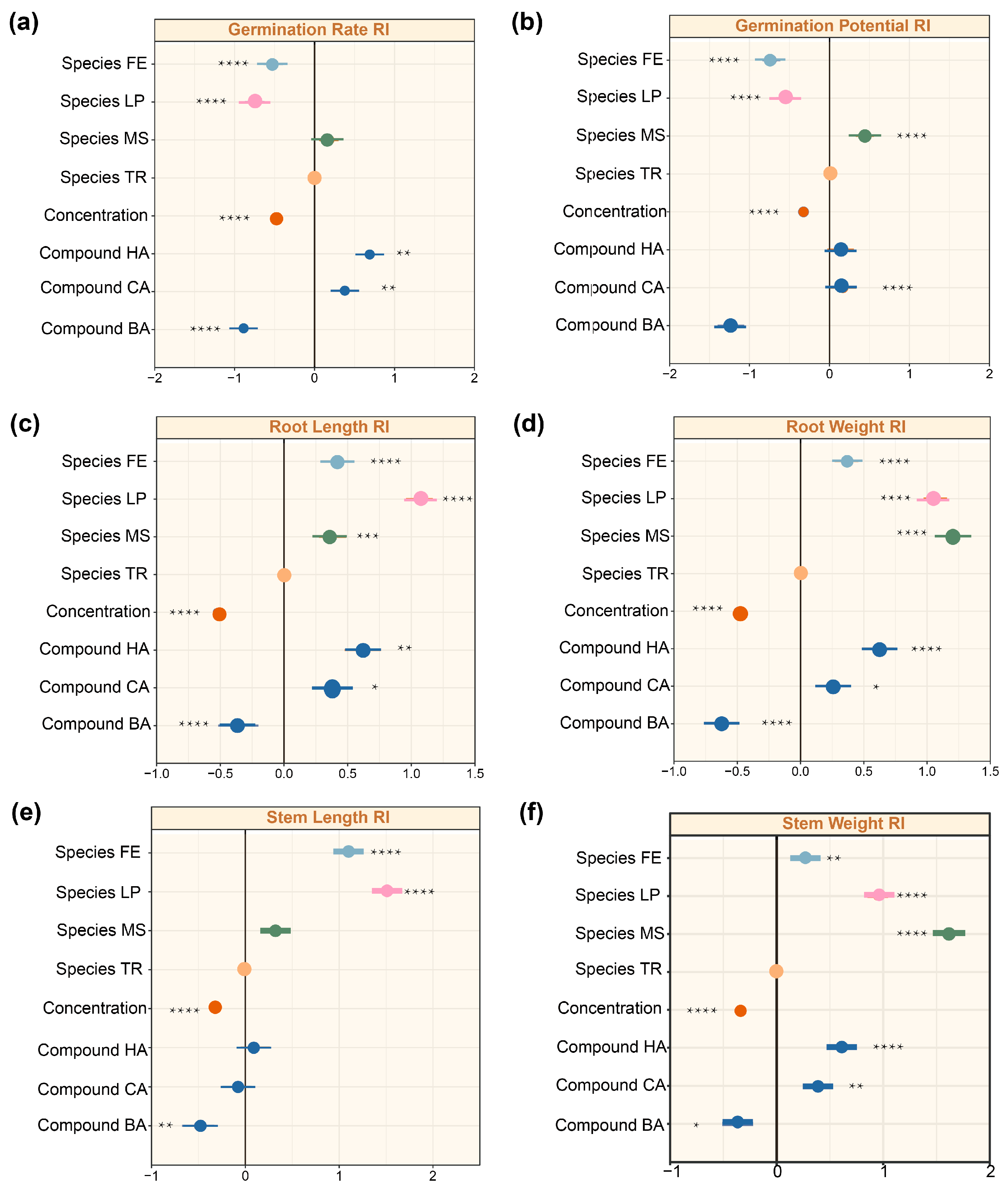 2.4. Allelopathic Response Index (RI) of Seedling Functional Traits