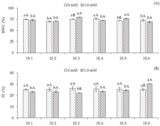 Relative water content—RWC% (A) and electrolyte leakage—EL% (B) of sour passion fruit cv. Redondo Amarelo, as affected by the interaction between irrigation strategies under water deficit and salicylic acid application, at 160 days after transplanting. The same lowercase letters indicate no significant difference among irrigation strategies under water deficit within each salicylic acid concentration (Scott-Knott test, p ≤ 0.05), while the same uppercase letters indicate no significant difference between salicylic acid concentrations within each irrigation strategy under water deficit (Tukey test, p ≤ 0.05). Vertical bars represent the standard error of the mean (n = 4). IS1—no water deficit throughout the crop cycle; IS2, IS3, IS4, IS5, and IS6—water deficit applied during the vegetative, flowering, fruiting, vegetative/flowering, and vegetative/fruiting stages, respectively.