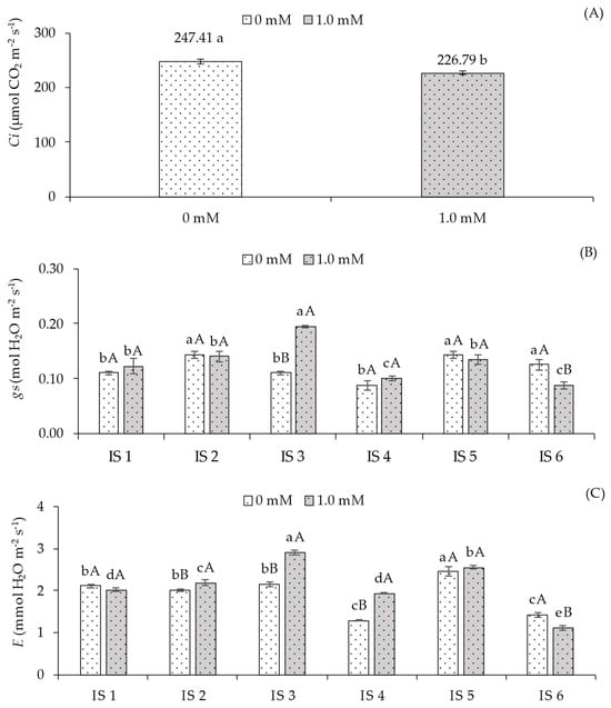 For stomatal conductance (gs) (Figure 2B), plants grown without SA application and subjected to water deficit during the vegetative (IS2), vegetative/flowering (IS5), and vegetative/fruiting (IS6) stages showed the highest values (0.14, 0.13, and 0.15 mol H2O m−2 s−1), differing statistically from those irrigated with 100% ETr throughout the cycle (IS1) and with water deficit during the flowering (IS3) and fruiting (IS4) stages. In plants receiving salicylic acid application, significant differences were observed in treatments IS3 and IS6. The 1.0 mM SA concentration resulted in a 43.69% increase (0.08 mol H2O m−2 s−1) in gs for plants under water deficit during flowering compared to plants without SA application (0.0 mM). Conversely, SA application in plants subjected to water deficit during the vegetative/fruiting stage led to a 42.86% reduction compared to those without SA.