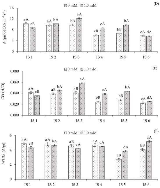 Intercellular CO2 concentration—Ci (A) as a function of salicylic acid concentrations, stomatal conductance—gs (B), transpiration rate—E (C), CO2 assimilation rate—A (D), instantaneous carboxylation efficiency—CEi (E), and instantaneous water use efficiency—WUEi (F) of sour passion fruit cv. Redondo Amarelo, as affected by the interaction between irrigation strategies under water deficit and salicylic acid application, at 160 days after transplanting. The same lowercase letters indicate no significant difference among irrigation strategies under water deficit within each salicylic acid concentration (Scott–Knott test, p ≤ 0.05), while the same uppercase letters indicate no significant difference between salicylic acid concentrations within each irrigation strategy under water deficit (Tukey test, p ≤ 0.05). Vertical bars represent the standard error of the mean (n = 4). IS1—no water deficit throughout the crop cycle; IS2, IS3, IS4, IS5, and IS6—water deficit applied during the vegetative, flowering, fruiting, vegetative/flowering, and vegetative/fruiting stages, respectively.