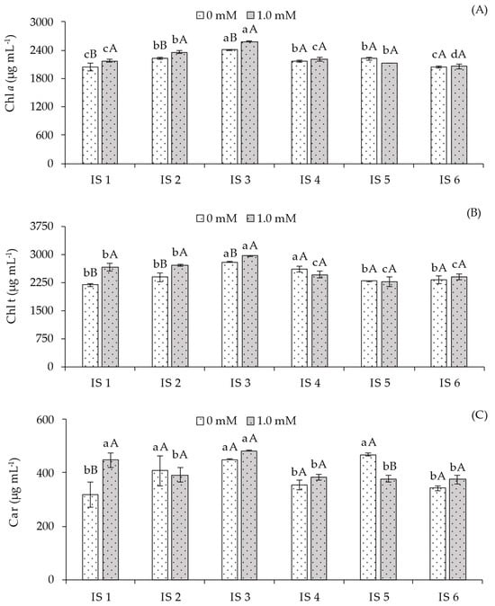 Chlorophyll a—Chl a (A), total chlorophyll—Chl t (B), and carotenoids—Car (C) of sour passion fruit cv. Redondo Amarelo, as affected by the interaction between irrigation strategies under water deficit and salicylic acid application, at 160 days after transplanting. The same lowercase letters indicate no significant difference among irrigation strategies under water deficit within each salicylic acid concentration (Scott–Knott test, p ≤ 0.05), while the same uppercase letters indicate no significant difference between salicylic acid concentrations within each irrigation strategy under water deficit (Tukey test, p ≤ 0.05). Vertical bars represent the standard error of the mean (n = 4). IS1—no water deficit throughout the crop cycle; IS2, IS3, IS4, IS5, and IS6—water deficit applied during the vegetative, flowering, fruiting, vegetative/flowering, and vegetative/fruiting stages, respectively.
