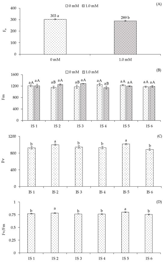 Initial fluorescence—F0 (A) as a function of salicylic acid concentrations, maximum fluorescence—Fm (B) as affected by the interaction between irrigation strategies under water deficit and salicylic acid application, variable fluorescence—Fv (C), and quantum efficiency of photosystem II—Fv/Fm (D) as a function of irrigation strategies under water deficit of sour passion fruit cv. Redondo Amarelo, at 160 days after transplanting. The same lowercase letters indicate no significant difference among irrigation strategies under water deficit within each salicylic acid concentration (Scott-Knott test, p ≤ 0.05), while the same uppercase letters indicate no significant difference between salicylic acid concentrations within each irrigation strategy under water deficit (Tukey test, p ≤ 0.05). Vertical bars represent the standard error of the mean (n = 4). IS1—no water deficit throughout the crop cycle; IS2, IS3, IS4, IS5, and IS6—water deficit applied during the vegetative, flowering, fruiting, vegetative/flowering, and vegetative/fruiting stages, respectively.
