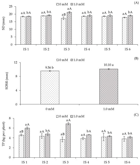 According to Table 5, a significant interaction effect between the factors (IS × SA) was observed only for the diameter of the main stem (SD) and total yield (TY). The average diameter of secondary branches (SBD) was influenced (p ≤ 0.05) only by salicylic acid concentrations.