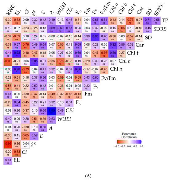 Pearson correlation matrix for the variables analyzed within the irrigation strategies and salicylic acid concentrations of 0.0 mM (A) and 1.0 mM (B), for the variables RWC (%), EL (%), Ci (µmol CO2 m−2 s−1), gs (mol H2O m−2 s−1), E (mol H2O m−2 s−1), A (µmol CO2 m−2 s−1), CEi (A/Ci), WUEi (A/E), Chl a (μg mL−1), Chl b (μg mL−1), Chl t (μg mL−1), Car (μg mL−1), Fo, Fm, Fv, Fv/Fm, SD (mm), SDRS (mm), TP (kg per plant). Relative water content—RWC (%), electrolyte leakage—EL (%), intercellular CO2 concentration—Ci (µmol CO2 m−2 s−1), stomatal conductance—gs (mol H2O m−2 s−1), transpiration rate—E (mol H2O m−2 s−1), CO2 assimilation rate—A (µmol CO2 m−2 s−1), instantaneous carboxylation efficiency—CEi (A/Ci), instantaneous water use efficiency—WUEi (A/E), chlorophyll a—Chl a (μg mL−1), chlorophyll b—Chl b (μg mL−1), total chlorophyll—Chl t (μg mL−1), carotenoids—Car (μg mL−1), initial fluorescence—Fo, maximum fluorescence—Fm, variable fluorescence—Fv, quantum efficiency of photosystem II—Fv/Fm, diameter of the stem of the main branch—SD (mm), mean diameter of the secondary branches—SDRS (mm), production per plant—TP (kg per plant). *, **, ***, ns—Significant at p ≤ 0.05, p ≤ 0.01, and not significant, respectively according to the f-test.