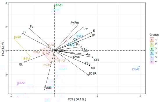The interaction between deficit irrigation strategies (IS) and salicylic acid (SA) concentrations can be observed in the principal component analysis (Figure 7). The PC accounted for 64.40% of the original variation, corresponding to the two components (PC1 and PC2), which individually explained 50.70% and 13.70% of the variance, respectively. The variables RWC, EL, Ci, gs, E, A, CEi, Fo, Fm, Fv, Chl a, Car, SD, SDSR, and TP were retained in the first component. Negative correlations were observed only for electrolyte leakage (−0.67), internal carbon concentration (−0.75), and initial chlorophyll a fluorescence (−0.60), which were favored by cluster 2. For the remaining variables, correlations were higher than 0.60, showing greater clustering in groups 4 and 5.