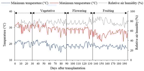 The experiment was conducted from December 2023 to August 2024 in a protected environment belonging to the Academic Unit of Agricultural Engineering (UAEA) at the Federal University of Campina Grande (UFCG), located in the municipality of Campina Grande city, PB, Brazil, at coordinates 07°15′18″ S latitude, 35°52′28″ W longitude, and an average altitude of 550 m. The greenhouse was of the hoop type, measuring 30 m in length and 21 m in width, with a ceiling height of 3.0 m, and covered with low-density polyethylene (150 microns). Maximum and minimum temperatures, as well as relative air humidity during the experiment, are shown in Figure 8. The average temperature ranged from 14.80 to 33.66 °C, while the relative humidity fluctuated between 65.51 and 89.06%.