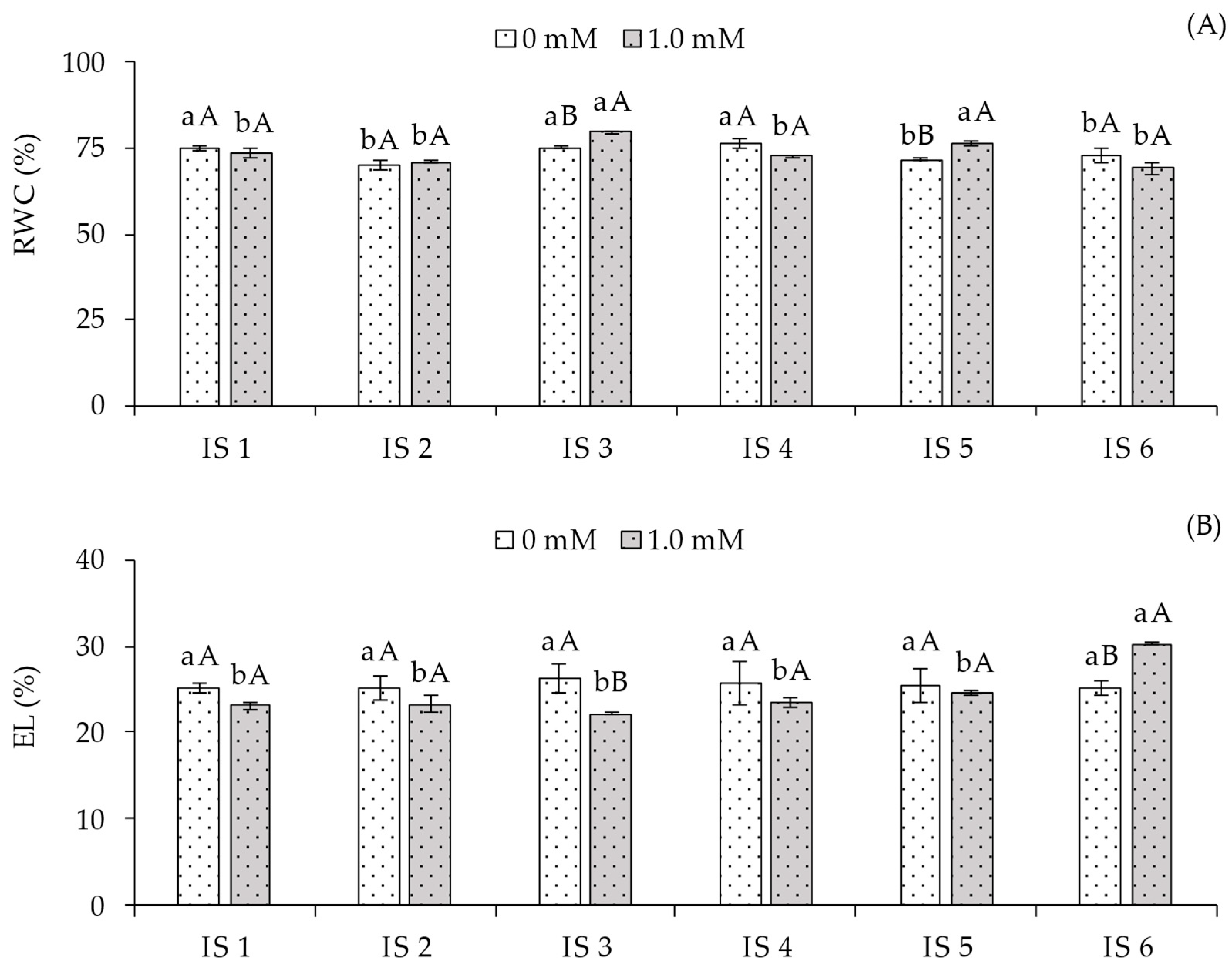 Nevertheless, the application of salicylic acid (SA) showed beneficial effects on relative water content (RWC) (Figure 1A) and a decrease in electrolyte leakage (EL) (Figure 1B), especially when SA was applied in combination with deficit irrigation during the flowering stage (IS3). The increase in RWC due to SA application is possibly related to its role in enhancing leaf water potential to maintain osmotic homeostasis [24], as well as maintaining stomatal opening, thereby improving water uptake under water-scarce conditions. It is important to highlight that the observed reduction in EL (Figure 1B) may be related to lower lipid peroxidation of cellular membranes, as salicylic acid contributes to maintaining oxidative homeostasis, the balance between the production and elimination of reactive oxygen species (ROS) [25], thus preserving membrane integrity and preventing electrolyte leakage.