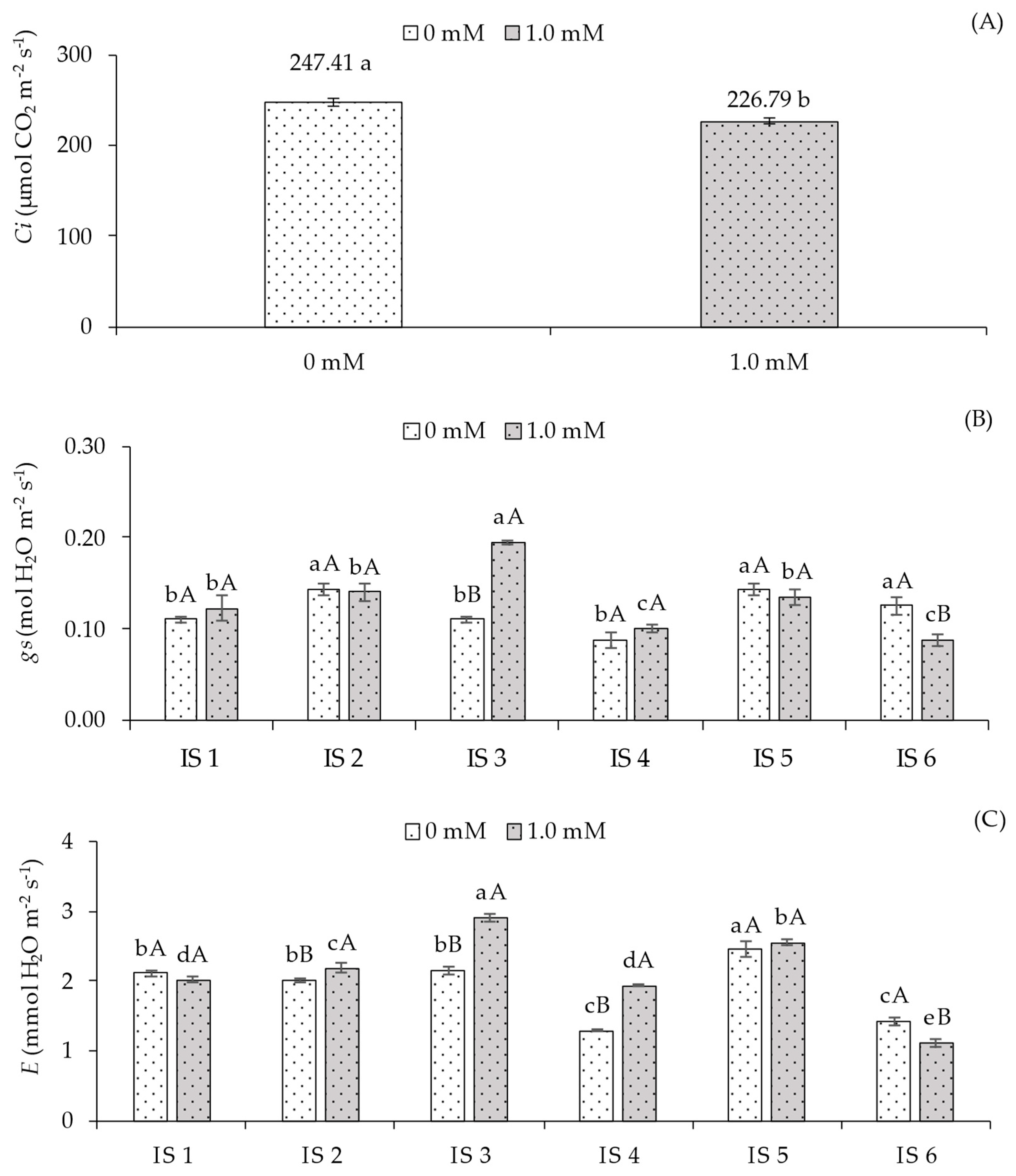 A significant effect was observed for the interaction between the different irrigation strategies under water deficit (IS) and salicylic acid (SA) concentrations on stomatal conductance (gs), transpiration rate (E), CO2 assimilation rate (A), instantaneous carboxylation efficiency (CEi), and instantaneous water use efficiency (WUEi) (Table 2). However, internal carbon concentration (Ci) was influenced only by the application of salicylic acid.