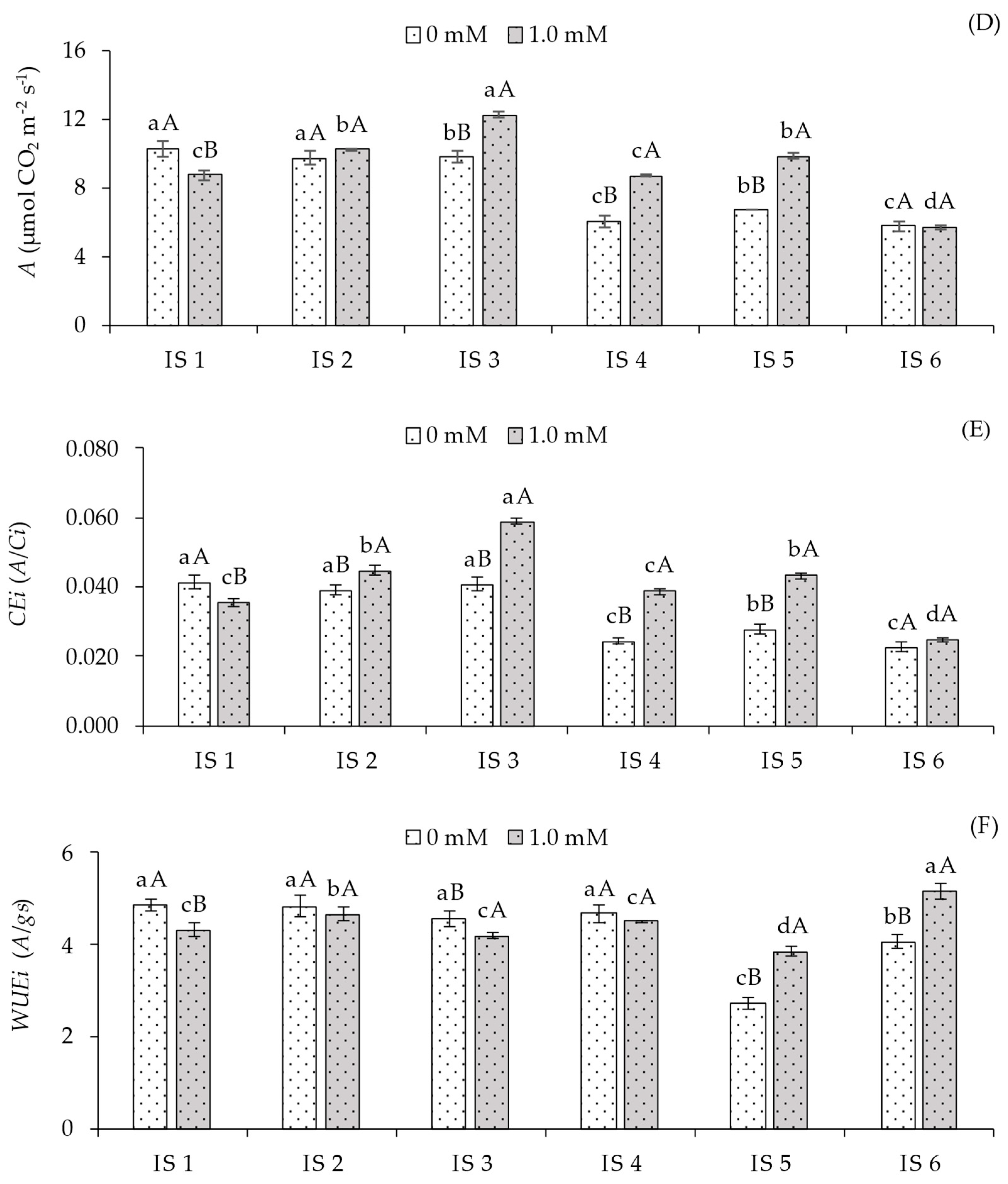 For the CO2 assimilation rate (A) (Figure 2D), in the absence of SA application, plants grown under full irrigation (100% ETr) throughout the cycle (IS1) and under water deficit during the vegetative (IS2) and flowering (IS3) stages differed significantly from those subjected to treatments IS4, IS5, and IS6. However, foliar application of 1.0 mM salicylic acid promoted positive responses in plants subjected only to strategies IS3, IS4, and IS5 compared to those grown without SA application.