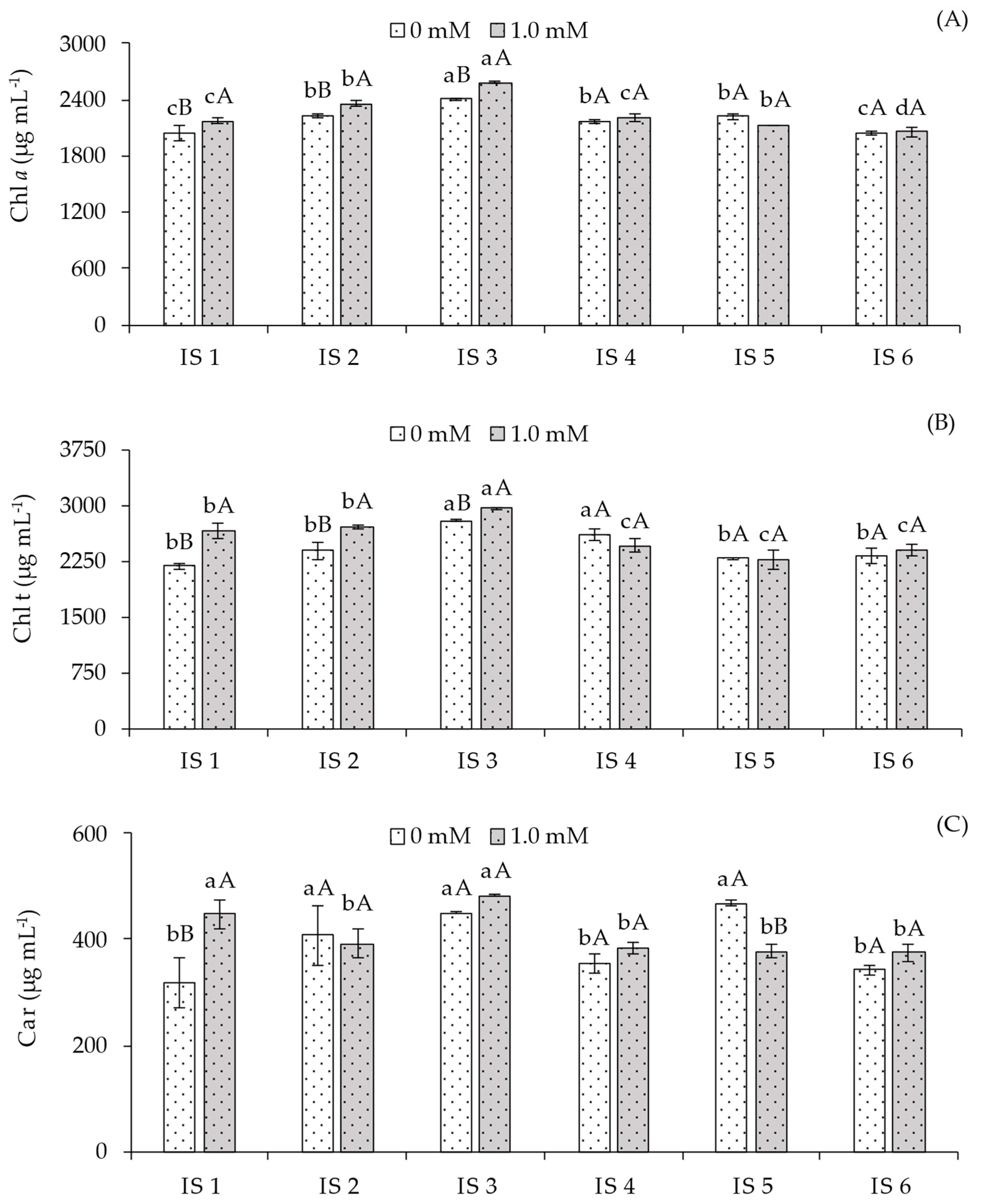 A significant interaction effect between deficit irrigation strategies (IS) and salicylic acid (SA) concentrations (p ≤ 0.05) was observed for chlorophyll a (Chl a), total chlorophyll (Chl total), and carotenoid (Car) contents (Table 3).