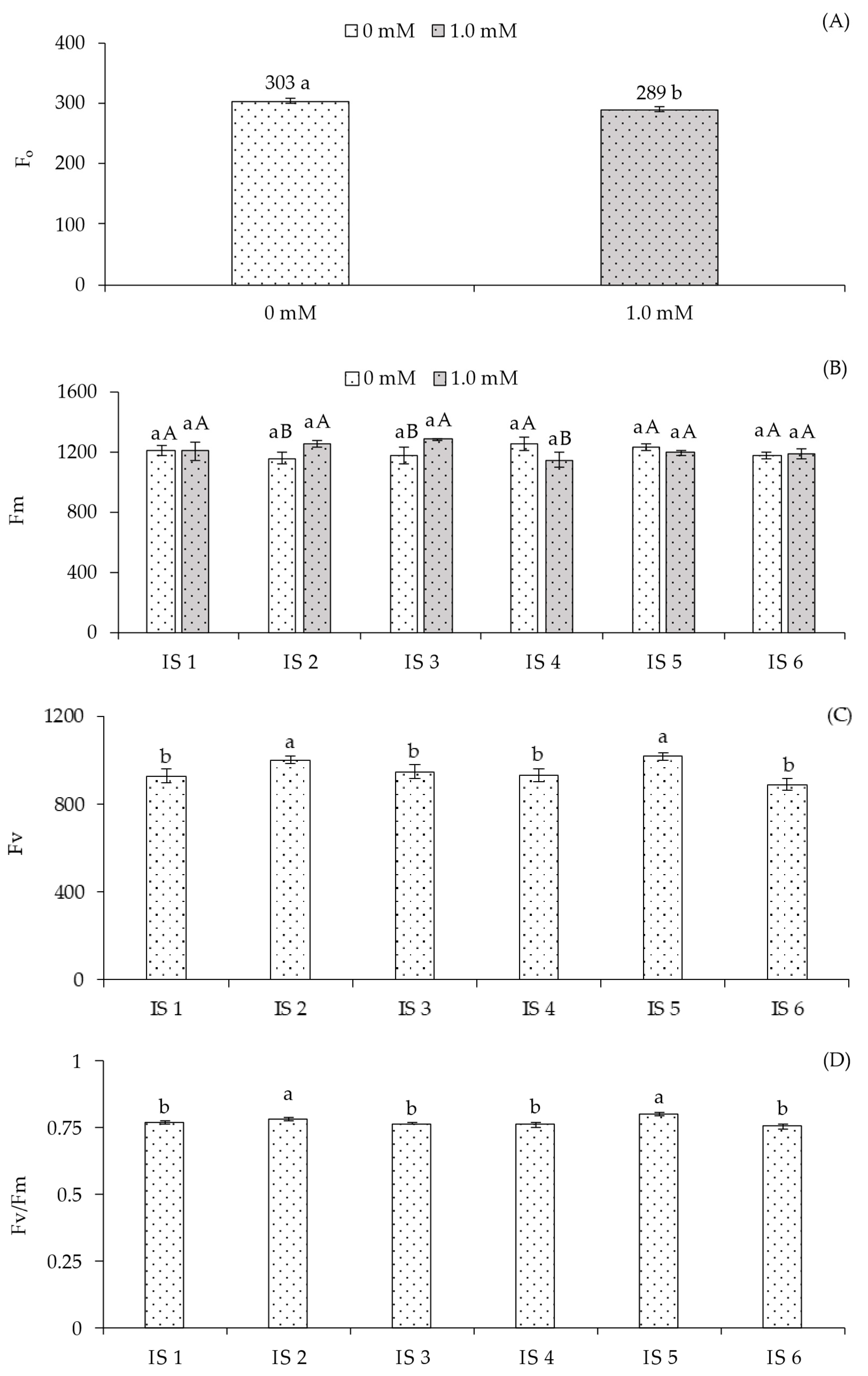 A significant interaction effect between the factors (IS × SA) was observed only for maximum fluorescence (Fm) (Table 4). Salicylic acid significantly influenced only the initial fluorescence (Fo), while the irrigation strategies significantly affected (p ≤ 0.05) variable fluorescence (Fv) and the quantum efficiency of photosystem II (Fv/Fm).
