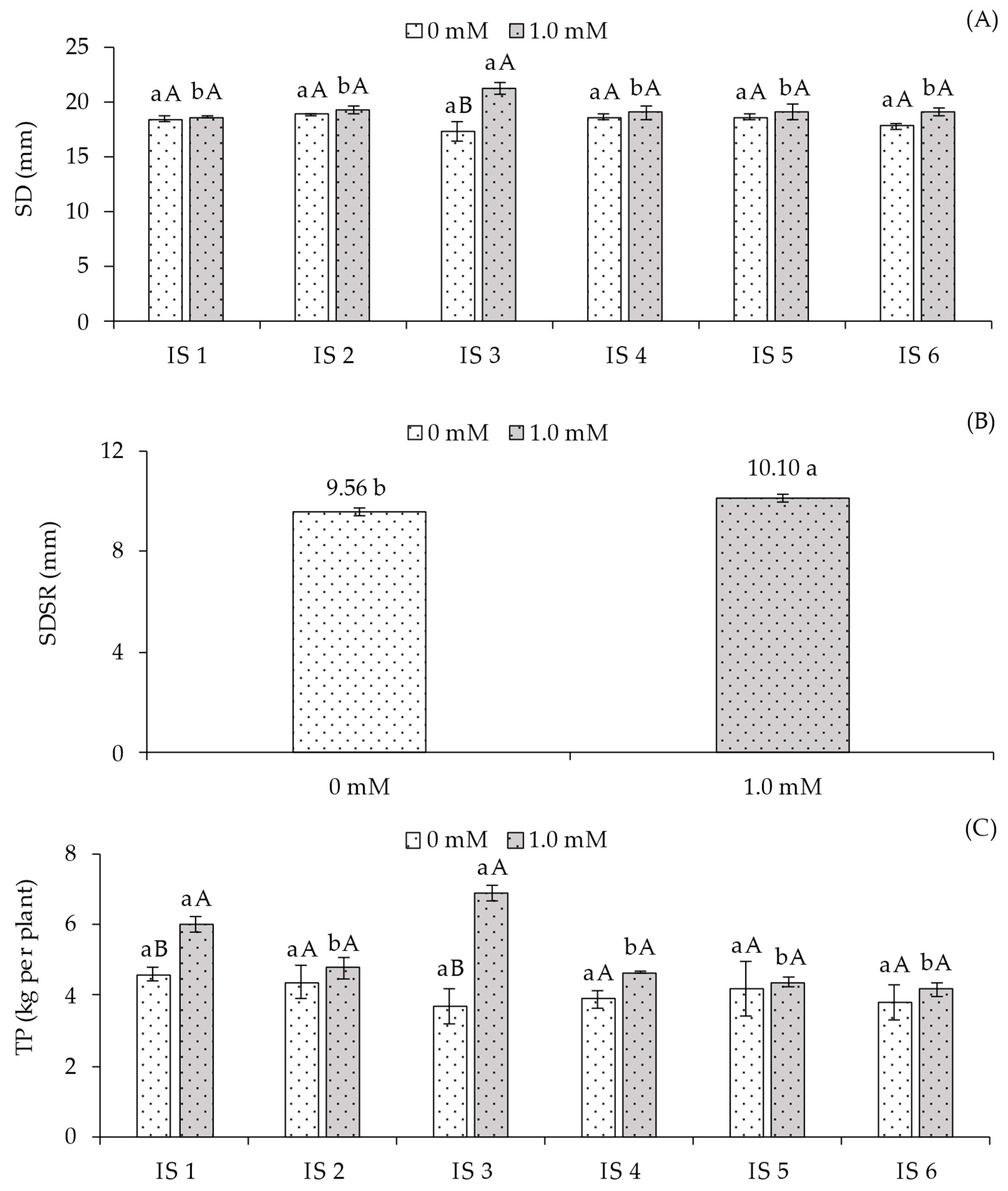 According to Table 5, a significant interaction effect between the factors (IS × SA) was observed only for the diameter of the main stem (SD) and total yield (TY). The average diameter of secondary branches (SBD) was influenced (p ≤ 0.05) only by salicylic acid concentrations.
