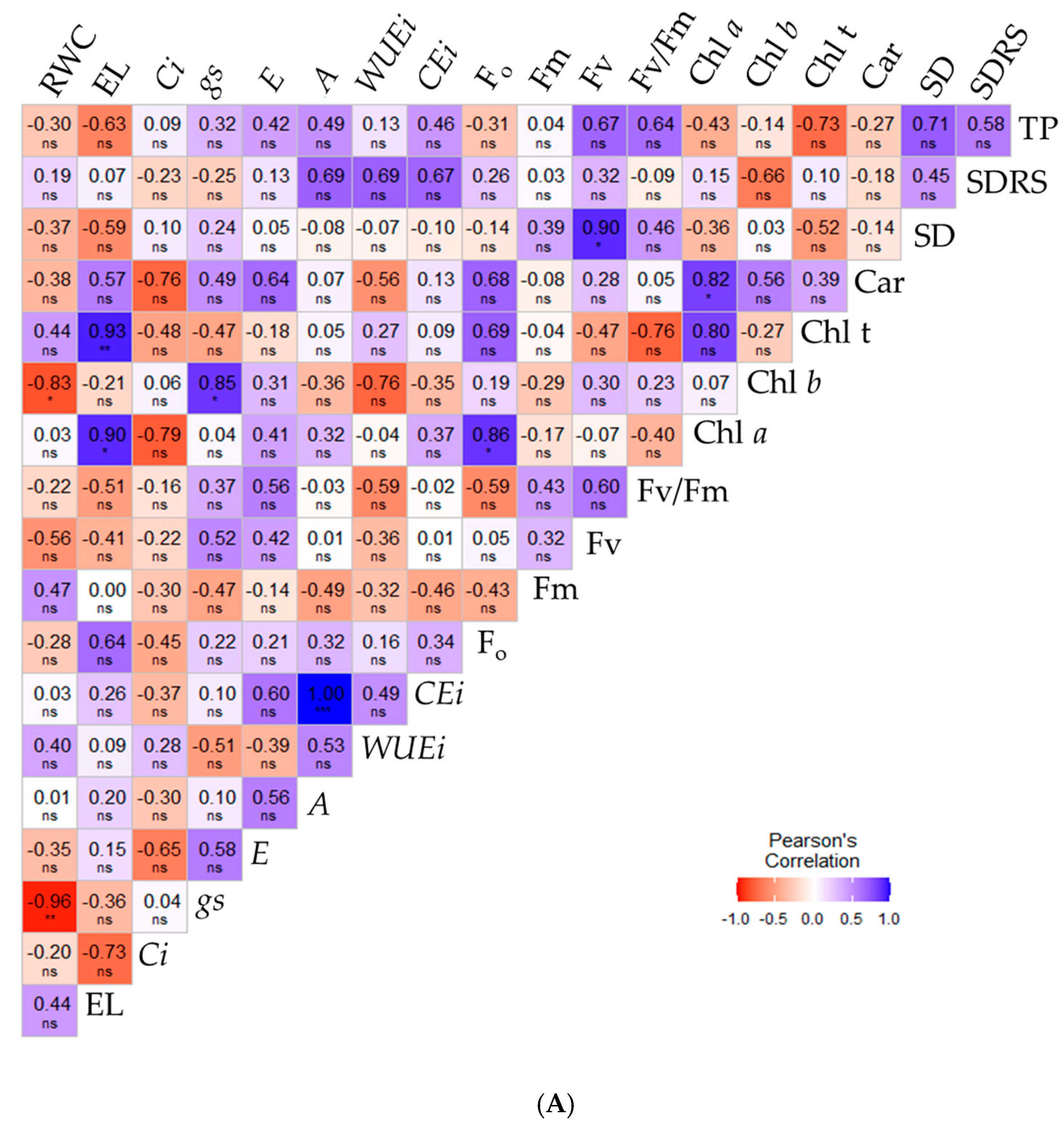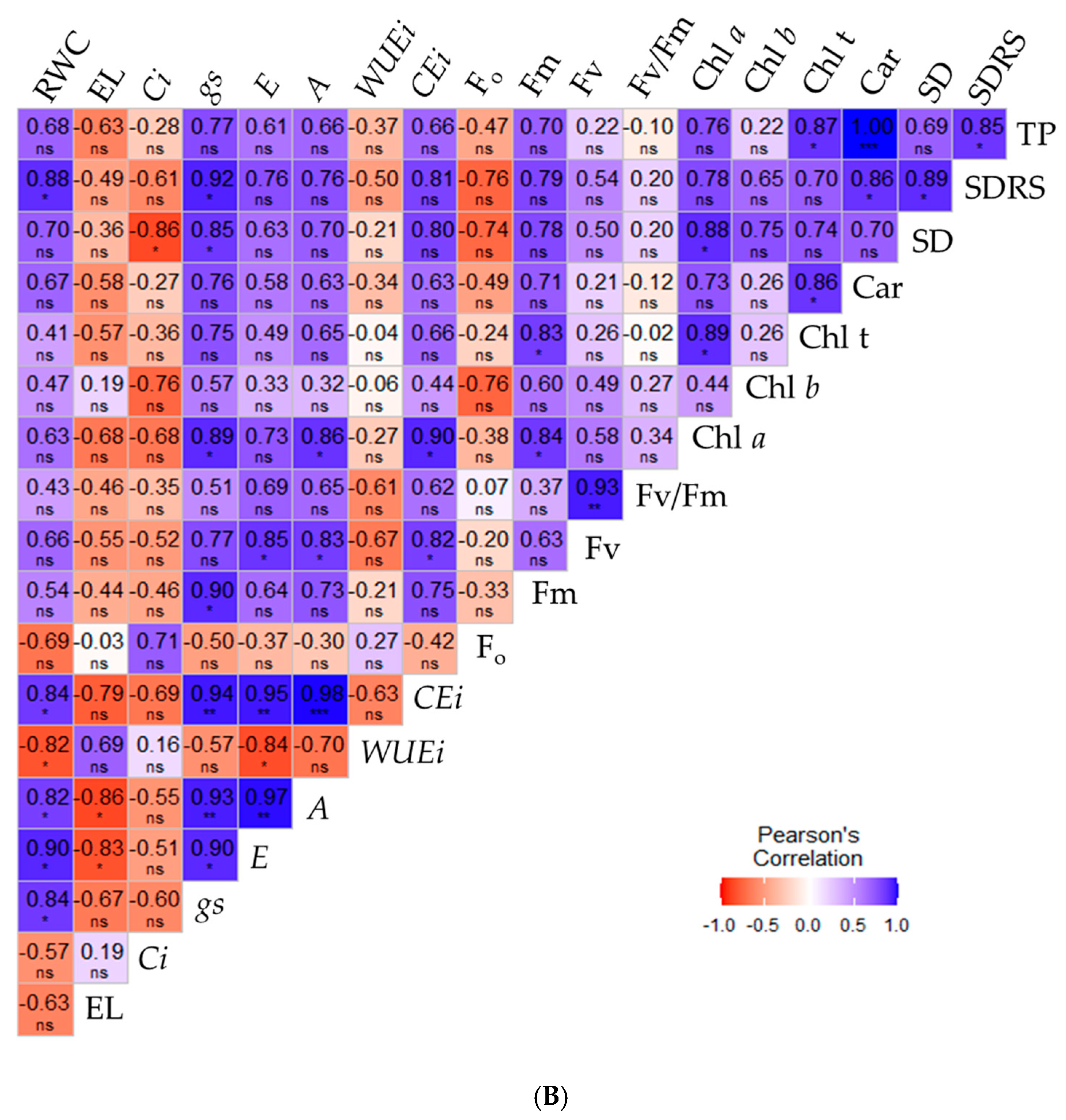Figure 6. Pearson correlation matrix for the variables analyzed within the irrigation strategies and salicylic acid concentrations of 0.0 mM (A) and 1.0 mM (B), for the variables RWC (%), EL (%), Ci (µmol CO2 m−2 s−1), gs (mol H2O m−2 s−1), E (mol H2O m−2 s−1), A (µmol CO2 m−2 s−1), CEi (A/Ci), WUEi (A/E), Chl a (μg mL−1), Chl b (μg mL−1), Chl t (μg mL−1), Car (μg mL−1), Fo, Fm, Fv, Fv/Fm, SD (mm), SDRS (mm), TP (kg per plant). Relative water content—RWC (%), electrolyte leakage—EL (%), intercellular CO2 concentration—Ci (µmol CO2 m−2 s−1), stomatal conductance—gs (mol H2O m−2 s−1), transpiration rate—E (mol H2O m−2 s−1), CO2 assimilation rate—A (µmol CO2 m−2 s−1), instantaneous carboxylation efficiency—CEi (A/Ci), instantaneous water use efficiency—WUEi (A/E), chlorophyll a—Chl a (μg mL−1), chlorophyll b—Chl b (μg mL−1), total chlorophyll—Chl t (μg mL−1), carotenoids—Car (μg mL−1), initial fluorescence—Fo, maximum fluorescence—Fm, variable fluorescence—Fv, quantum efficiency of photosystem II—Fv/Fm, diameter of the stem of the main branch—SD (mm), mean diameter of the secondary branches—SDRS (mm), production per plant—TP (kg per plant). *, **, ***, ns—Significant at p ≤ 0.05, p ≤ 0.01, and not significant, respectively according to the f-test.