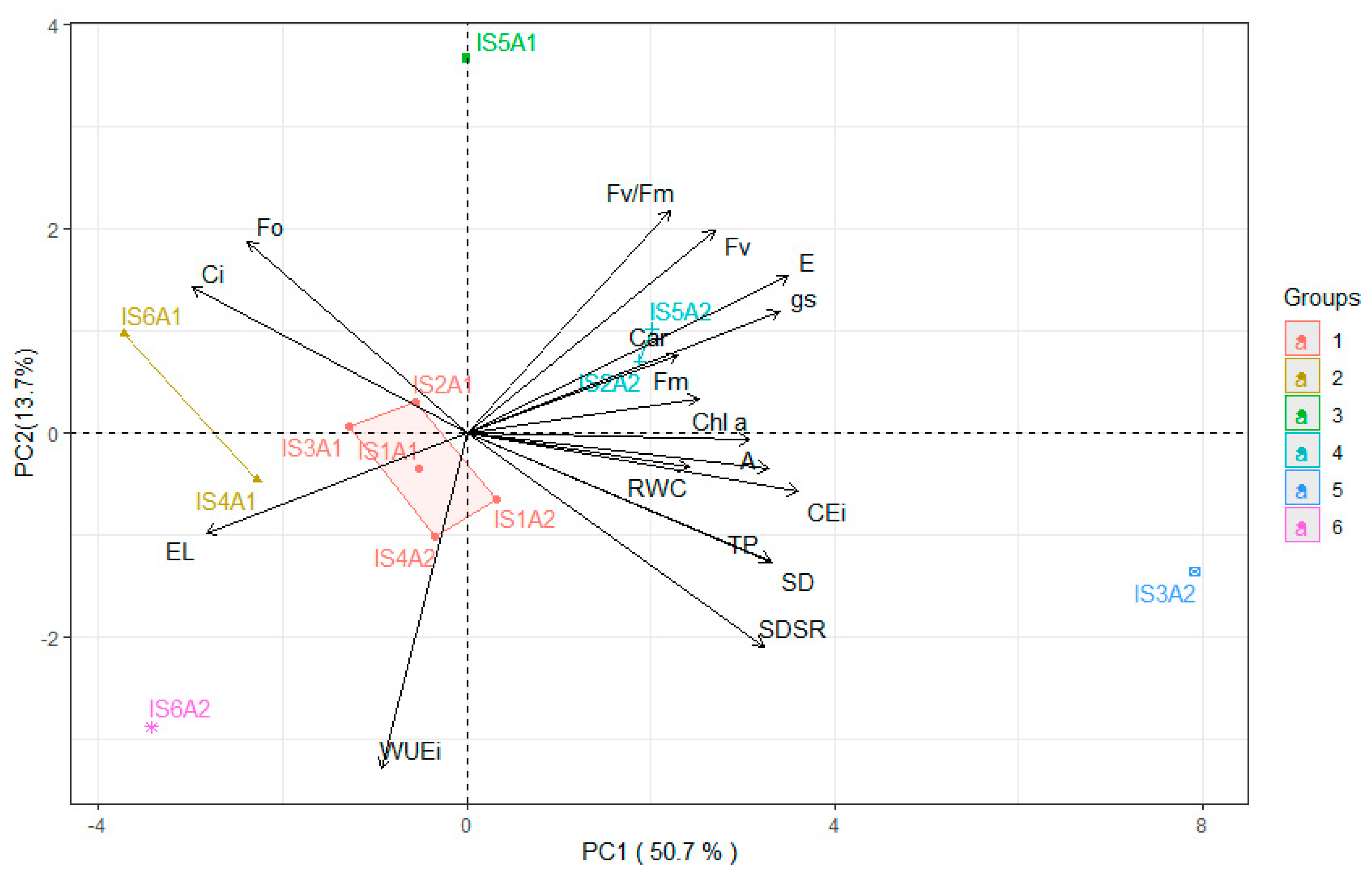 Figure 7. Two-dimensional projection of the principal component scores for deficit irrigation strategies (IS) and salicylic acid (SA) concentrations, showing the distribution of the analyzed variables across the two principal components (PC1 and PC2). Relative water content—RWC (%), electrolyte leakage—EL (%), intercellular CO2 concentration—Ci (µmol CO2 m−2 s−1), stomatal conductance—gs (mol H2O m−2 s−1), transpiration rate—E (mol H2O m−2 s−1), CO2 assimilation rate—A (µmol CO2 m−2 s−1), instantaneous carboxylation efficiency—CEi (A/Ci), instantaneous water use efficiency—WUEi (A/E), chlorophyll a—Chl a (μg mL−1), carotenoids—Car (μg mL−1), initial fluorescence—Fo, maximum fluorescence—Fm, variable fluorescence—Fv, quantum efficiency of photosystem II—Fv/Fm, diameter of the stem of the main branch—SD (mm), mean diameter of the secondary branches—SDRS (mm), production per plant—TP (kg per plant). IS1A1 (no water deficit throughout the crop cycle and 0 mM salicylic acid); IS2A1(water deficit applied during the vegetative stage and 0 mM salicylic acid); IS3A1(water deficit applied during the flowering stage and 0 mM salicylic acid); IS4A1(water deficit applied during the fruiting stage and 0 mM salicylic acid); IS5A1(water deficit applied during the vegetative/flowering stage and 0 mM salicylic acid); IS6A1(water deficit applied during the vegetative/fruiting stage and 1.0 mM salicylic acid); IS1A2 (no water deficit throughout the crop cycle and 1.0 mM salicylic acid); IS2A2(water deficit applied during the vegetative stage and 1.0 mM salicylic acid); IS3A2(water deficit applied during the flowering stage and 1.0 mM salicylic acid); IS4A2(water deficit applied during the fruiting stage and 1.0 mM salicylic acid); IS5A2(water deficit applied during the vegetative/flowering stage and 1.0 mM salicylic acid) and IS6A2(water deficit applied during the vegetative/fruiting stage and 1.0 mM salicylic acid).