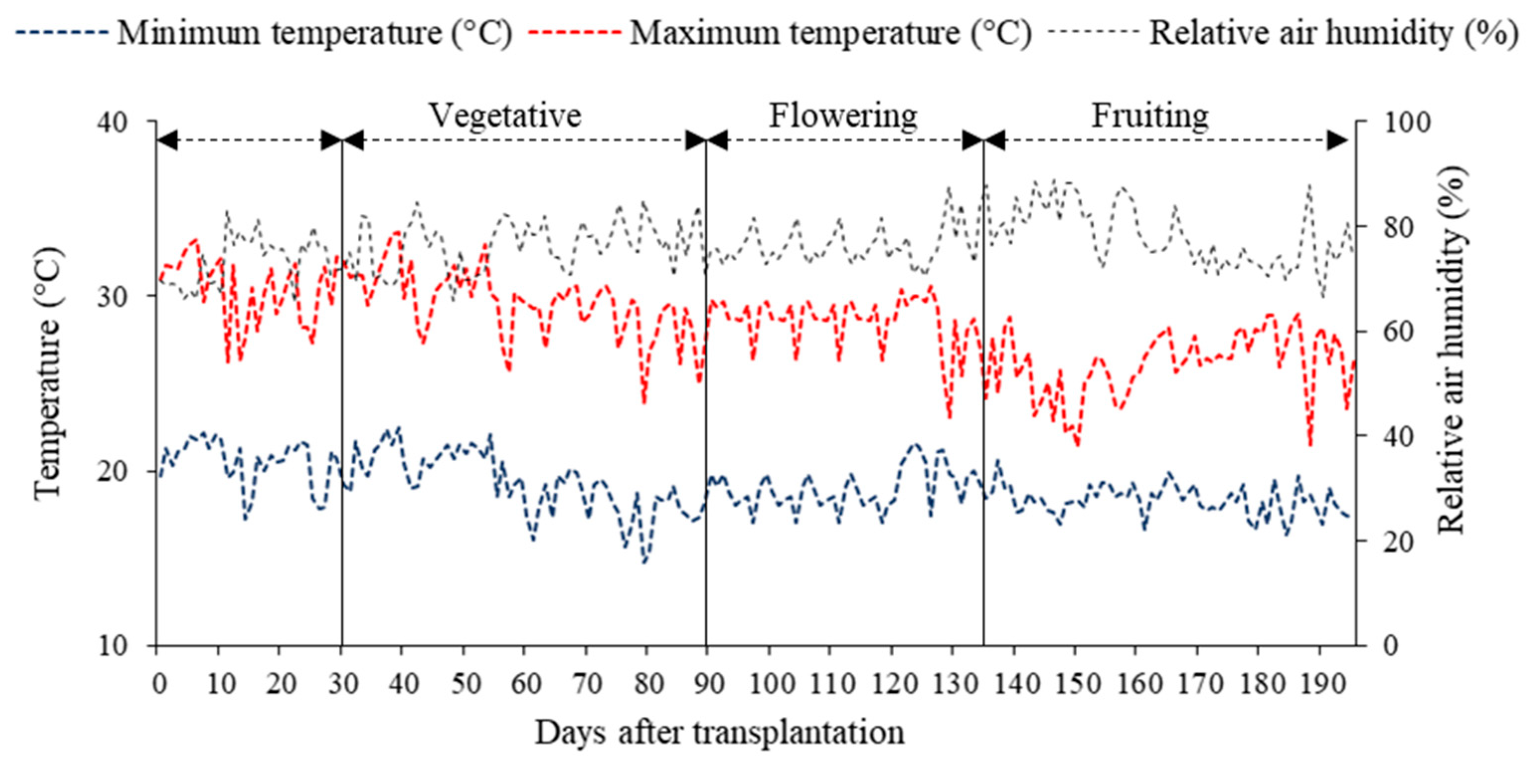 Figure 8. Maximum and minimum temperature and relative air humidity inside the greenhouse from 27 December 2023 to 4 August 2024.