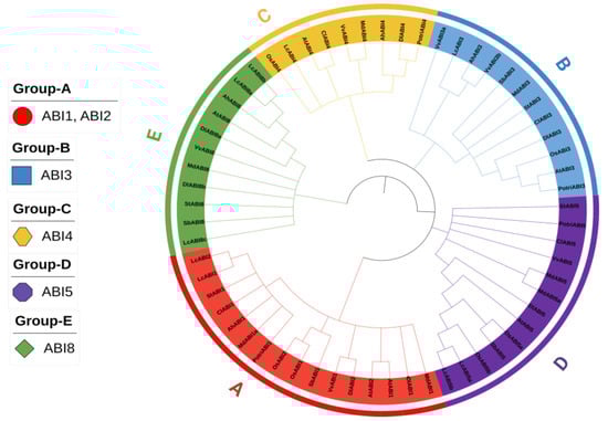 To elucidate the evolutionary relationships and functional diversification of DlABI genes, a phylogenetic tree was reconstructed from a multiple sequence alignment of the conserved ABI protein domain. The current investigation incorporated 61 ABI protein sequences from a diverse set of plant species, including Arabidopsis thaliana (L.) Heynh., Oryza sativa subsp. japonica Kato, Litchi chinensis Sonn, Malus domestica Borkh., Vitis vinifera L., Solanum tuberosum L., Populus trichocarpa Torr. & A. Gray, Arachis hypogaea L., Sorghum bicolor (L.) Moench, and Citrullus lanatus (Thunb.) Matsum. & Nakai. The phylogenetic analysis characterized ABI genes into five well-supported clades (A–E), each of which corresponds to a specific ABI class defined by its domain architecture. The first specific class (Group A) contains a total of 16 ABI-1 (abscisic acid-insensitive-1) and ABI-2 (abscisic acid-insensitive-2) genes, which share a common protein domain named PP2C. Group B contains 12 ABI3 genes, each having a B3 protein domain. The ABI4 (Group C) and ABI5 (Group D) included 9 and 13 genes, respectively, whereas the ABI8 (Group E) comprised a total of 11 genes. The protein domain AP2/ERF belongs to the ABI4 class, bZIP to the ABI5 group, and ABI8 is linked to the glycotransferase-92 protein domain. It is clear from their topology that longan ABI genes share common ancestral origins with their orthologs in Arabidopsis, apple, and grape. Notably, a closer phylogenetic affinity was observed between longan and apple ABI genes that potentially reflects their shared status as woody perennial plants. Overall, the strong clustering of orthologous sequences within each clade demonstrates a greater degree of evolutionary conservation among ABI transcription factors across the monocot–dicot classes (Figure 1).