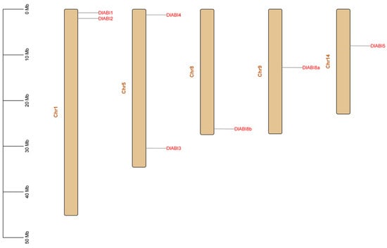 The chromosomal localization results revealed that the seven identified longan ABI genes are unevenly dispersed across six different chromosomes, with no evidence of tight physical clustering (Figure 2). Specifically, DlABI1 is located on chromosome 2, DlABI2 is located on chromosome 1, and DlABI3 and DlABI4 are decentralized on chromosome 5, while DlABI5, DlABI8a, and DlABI8b are located on chromosome 9, chromosome 8, and chromosome 14, respectively. This distribution pattern suggests that the DlABI gene family members may have arisen from segmental or dispersed duplication events rather than tandem duplication.
