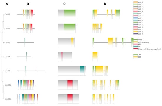To predict the conserved motifs in longan ABI genes (with accession numbers Dlo000068, Dlo000217, Dlo012591, Dlo010457, Dlo029652, Dlo020261, and Dlo019087), the online software MEME (https://meme-suite.org/meme/tools/meme (accessed on 17 July 2025)) version 5.5.5 was used. It was used to set the range of motif numbers up to 10 and NCBI (https://www.ncbi.nlm.nih.gov/Structure/index.shtml, accessed on 15 July 2025). Tbtools software [] was used for annotating chromosomal locations, gene structures, motifs, and conserved domains.