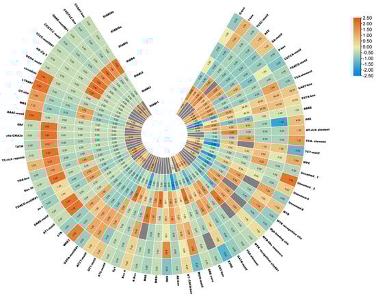 To further evaluate the potential of DlABI genes and their response to hormones or environmental cues, the CREs (cis-regulatory elements) analysis results obtained through 2 KB promoter sequences upstream of the DlABI initiation codon (ATG) revealed a total of 1045 cis elements. We divided these elements into different categories and further subgroups in each class to express their specific roles. Our findings revealed that the numerous cis-acting elements in the promoter regions of DlABI genes were characterized as light-responsive, hormone-related, and promoter-associated. The class of light response-related cis-acting elements contains Box 4, G box, ATCT motif, GT1 motif, GATA motif, TCCC motif, ATC motif, TCT motif, GA motif, ACE, I box, Sp1, AE box, ARE, MYC, MYB, MYB-like sequence, Myb binding site, MYB recognition site, LTR, AT-rich element, MBS, STRE, MBS, MBSI, and DRE core. The plant growth and development class was further subdivided into meristem, metabolism, and circadian rhythm, while the hormone-related class contained abscisic acid responsive (ABRE), MeJA responsive (CGTCA motif, TGACG motif, TATC box), gibberellin responsive (p box, GARE motif, TATC box), auxin responsive (TGA-element, AuxRR-core), and ethylene responsive (ERE) cis elements in seven putative longan ABI genes. These cis-regulatory elements are the molecular bridge that connects gene expression to signaling molecules like ABA and MeJA. The cis elements affiliated with anaerobic induction, drought inducibility, low-temperature sensitivity, defense, stress responsiveness, and wound responsive element are enclosed in the stress-related category along with ARE, MBS, LTR, TC-rich repeats, WUN motif, and GC motif cis elements. The cis elements MBS1, O2-site, and MSA elements are linked to many aspects of metabolism, such as zein metabolism, palisade mesophyll cells, protein binding sites, cell cycle regulation, and flavonoid biosynthesis. The meristem expression’s CAT box and CCGTCC motif are examples of cis elements associated with meristems. Certain gene promoters contained endosperm-related cis elements, such as the GCN4 motif and AACA motif. These elements indicate potential regulatory roles of DlABI genes in hormones and stress-associated transcription, which further require expression verification (Figure 4).