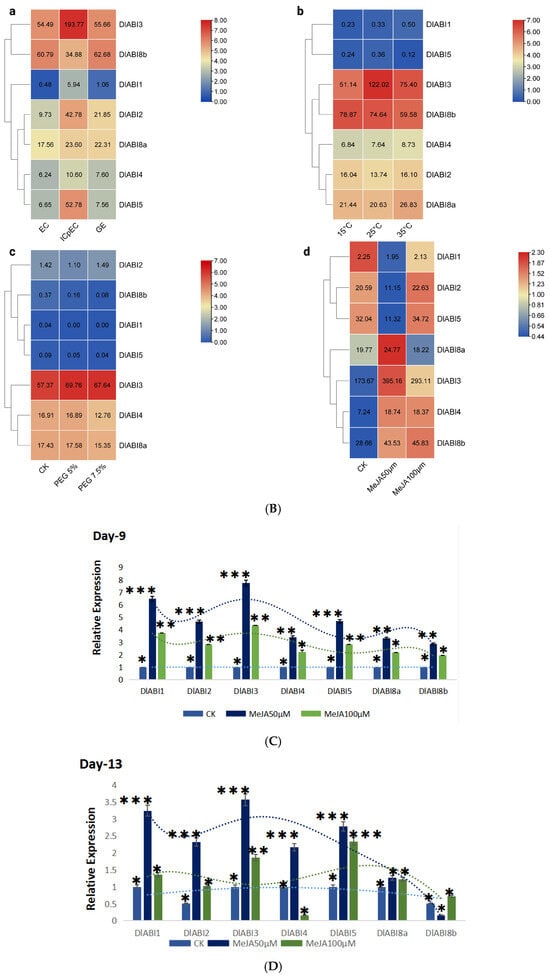 Further, we analyzed the expression patterns of seven DlABI genes under different concentrations of exogenous MeJA treatments at 9 and 13 days via qRT-PCR (Figure 7C). In general, expression was significantly up- or downregulated in both the MeJA 50 µM and MeJA 100 µM treatment groups compared with the control. On the ninth day, the expression of DlABI3 in MeJA 50 µM was significantly upregulated, followed by DlABI1, DlABI2, DlABI5, DlABI4, and DlABI8a, respectively. DlABI8b showed downregulation on the ninth day in MeJA 50 µM. On the ninth day, MeJA 100 µM depicted significantly less upregulation in five DlABI genes in comparison with MeJA 100 µM treatment, except that DlABI8a and DlABI8b showed downregulation.