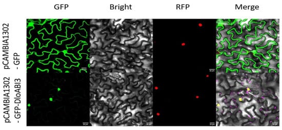 The binary vectors for the expression of the GFP fusion proteins under the control of the 35S promoter were constructed via LR reaction using the corresponding entry clones. The full-length DlABI3 and NLS marker protein were cloned into the destination pBWA(V)HS-GFP vectors. All vectors were transformed in Agrobacterium tumefaciens strain GV3101 and, prior to infiltration, were resuspended in the MMA solution (10 mM MgCl2, 120 μM acetosyringone, and 10 mM MES) to OD600 = 0.8. Corresponding Agrobacterium strains containing the target gene with GFP constructs and the NLS marker plasmid (marker) were mixed 1:1 and co-infiltrated into the leaves of 2–4-week-old N. benthamiana plants. NLS-mKate, a nucleus marker far-red fluorescent protein (mKate) with an N-terminal nucleus-localized DlABI3, was used. The abaxial epidermis of infiltrated tobacco leaves was assayed for fluorescence by confocal laser-scanning microscopy 2–3 days post infiltration [].