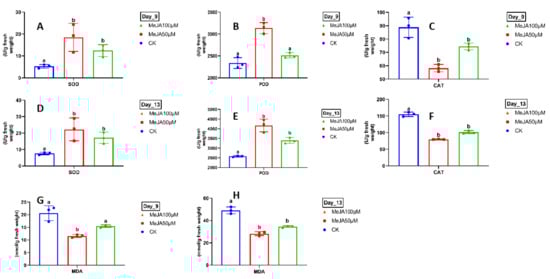 The measurement of reactive oxygen species (ROS) enzyme activity and malondialdehyde (MDA) in CK and MeJA treatment of longan Ec after the 9th day and 13th day. Data is the mean (n = 3) of three biological replicates with bars showing SD, and the lower-case letters above the bars indicate significant differences among treatments based on ANOVA followed by a t-test (p < 0.05). The ROS activities measured (A,D). SOD in (U/g fresh weight), H2O2 in (μmol/g fresh weight) (B,E). POD in (U/g fresh weight) (C,F). CAT in (U/g fresh weight) and (G,H) the malondialdehyde (MDA) in (nmol/g fresh weight).