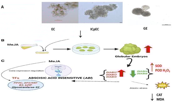 The molecular mechanism and regulatory network of DlABI during SE in longan. (A) The DlABI genes expressed during early somatic embryogenesis, i.e., embryogenic callus (EC), incomplete pro-embryogenic cultures (ICpCs), and globular embryo (GE). (B) DlABI in response to different MeJA concentrations greatly affected the GE (globular embryo) formation in longan. (C) The up- and downregulation expression of DlABI genes and related transcription factors that could participate in various hormonal pathways, ROS activity, and signal transduction ultimately affects the early stages of callus development in longan. The abbreviations used are MeJA (methyl jasmonic acid), SOD (superoxide dismutase), POD (peroxidase), CAT (catalase), H2O2 (hydrogen peroxide), and MDA (malondialdehyde).