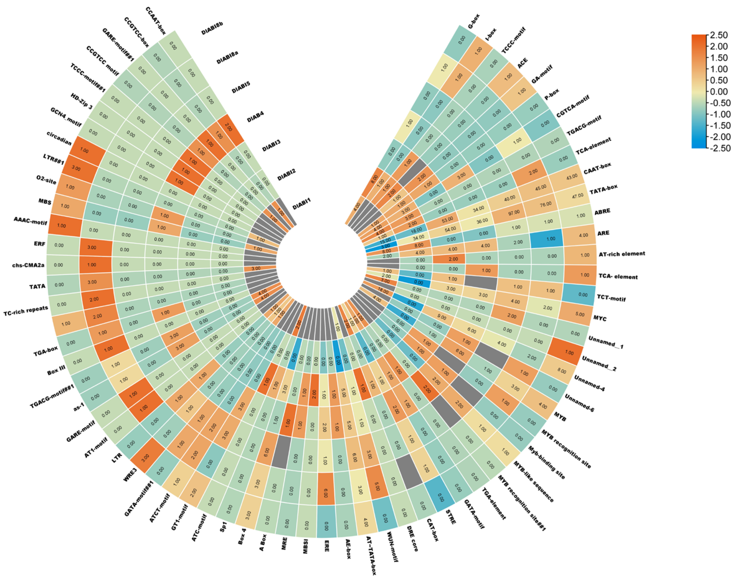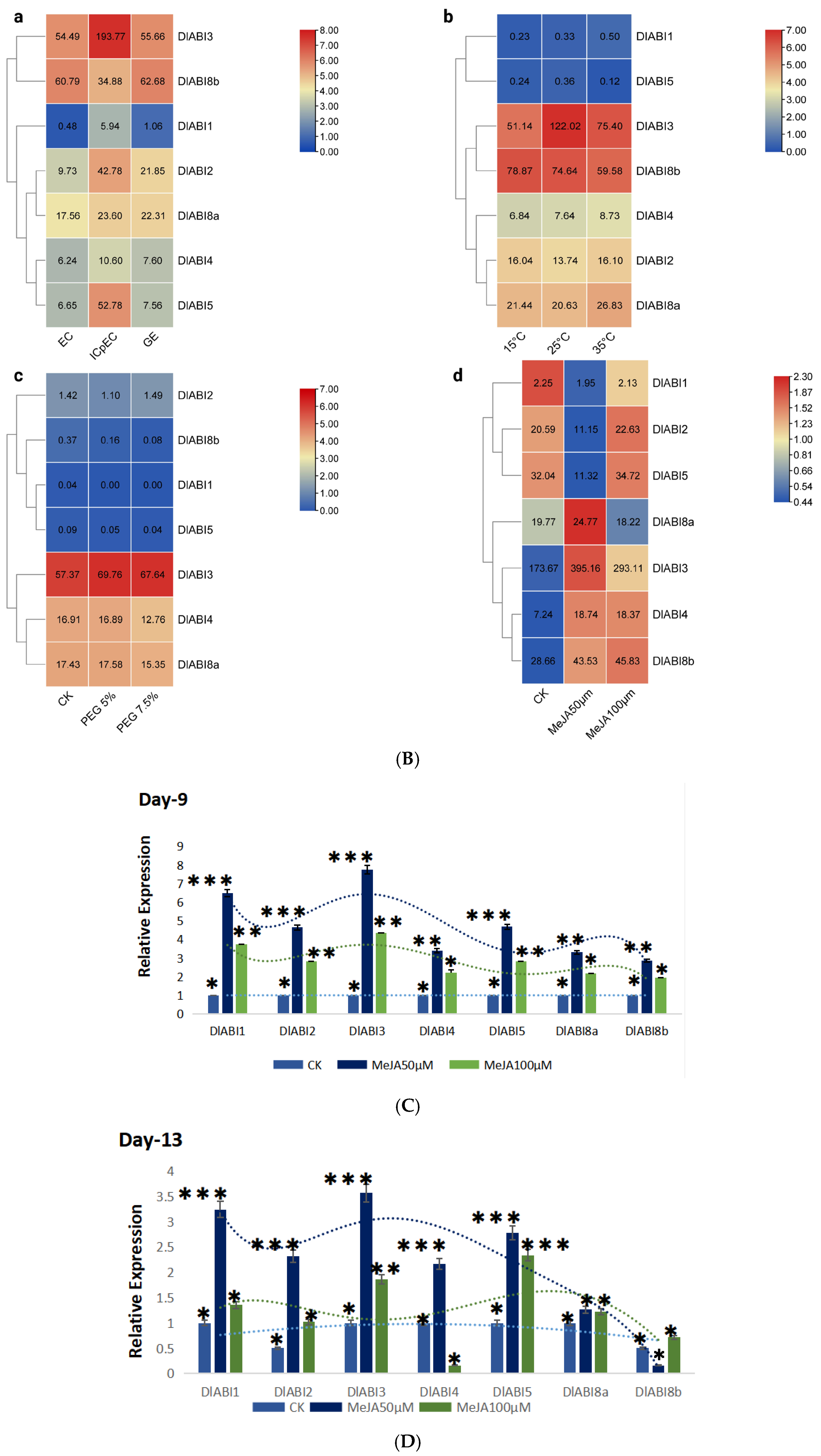 2.7. Morphological Changes Assessment, Heat Map Expression Profiling, and the qRT-PCR Analysis of DlABI Genes in Response to MeJA Treatment