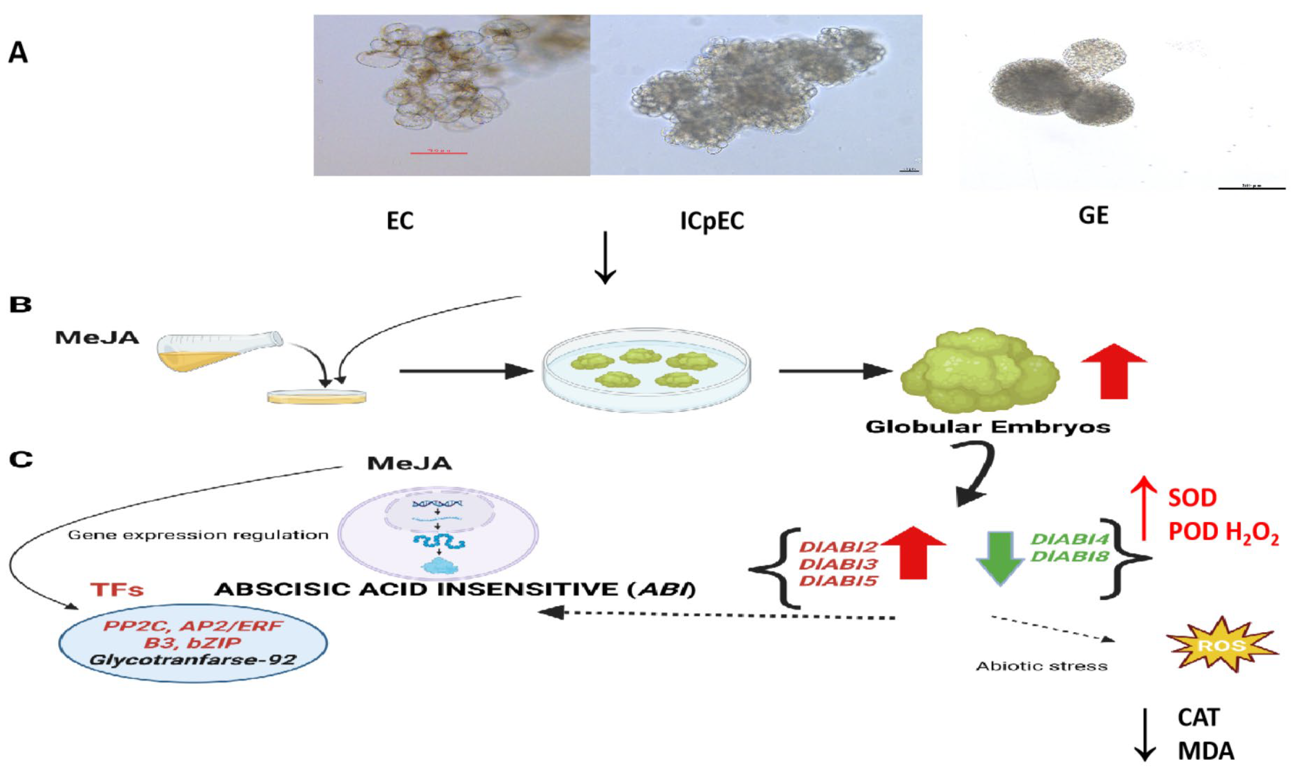 3.2. DlABI May Regulate the Early Somatic Embryogenesis of Longan in Response to MeJA by Maintaining ROS Activity