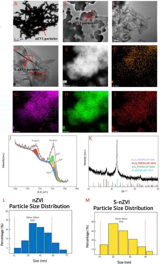 Transmission electron microscopy (TEM) images of (A) nanoscale zero−valent iron (nZVI) and (B–D) sulfide−modified nanoscale zero−valent iron (S−nZVI) at different resolutions; (E) energy−dispersive X−ray spectroscopy (EDS) spectrum of S−nZVI; (F–I) elemental mapping of carbon (C), oxygen (O), sulfur (S), and iron (Fe) in S−nZVI; (J) X−ray photoelectron spectroscopy (XPS) spectrum and (K) X−ray diffraction (XRD) pattern of S−nZVI; (L) Statistics of nZVI particle size distribution; (M) S−nZVI particle size distribution statistics. Note: The red dotted lines in (L) and (M) represent the range of particle size.