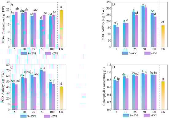 SOD can protect cells against the damage caused by reactive oxygen free radicals and repair damaged cells promptly. POD is a kind of redox enzyme produced by plants, which can catalyze the oxidation of hydrogen peroxide, phenol oxides, and hydrocarbons, while eliminating toxic substances such as hydrogen peroxide, phenols, and amines []. The content of MDA can reflect the degree to which plants are affected by adversity. It is often used as an indicator of lipid peroxidation to measure the degree of peroxidation of cell membrane lipids, plant aging, and the intensity of the response to adversity []. This study showed that the MDA content of S−nZVI was 12% lower than that of nZVI at 50 mg L−1, and the activities of SOD and POD were 10% and 15% higher, respectively, indicating that vulcanization modification reduced oxidative stress. This finding was consistent with the research results of Wang [] and others, which showed that nano−iron can stimulate the activity of H2O2, SOD, and POD, thereby enhancing the photosynthesis and respiration of plants.