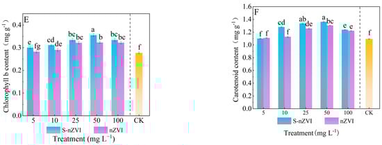 The antioxidant capacity of Chinese cabbage under control, nZVI, and S−nZVI treatments. The 10−day−old seedlings were treated, and the leaves of 45−day−old seedlings were collected to determine malondialdehyde (MDA) content (A), superoxide dismutase (SOD) activity (B), peroxidase (POD) activity (C), and three photosynthetic pigments: chlorophyll a content (D), chlorophyll b content (E), and carotenoid content (F). The value is the mean ± standard deviation (n = 6), and the bar chart shows the standard deviation. Columns with different letter markers indicated significant differences between treatments (p < 0.05, Duncan test).