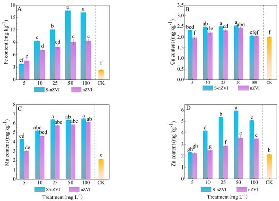 Trace elements in Chinese cabbage under control, nZVI, and S−nZVI treatments. The seedlings of 10 days old were treated, and the leaves of 45 days old were collected to determine the content of Fe (A), Mn (B), Cu (C), and Zn (D). The value is mean ± standard deviation (n = 6), and the bar chart represents the standard deviation. Columns with different letter markers indicated significant differences between treatments (p < 0.05, Duncan test).
