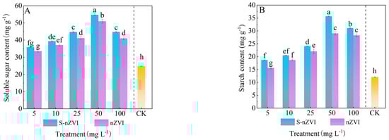 The impact of foliar−applied two kinds of iron−based NMs on the accumulation of soluble sugars and starch in Chinese cabbage leaves is illustrated in Figure 4. Both starch and soluble sugar contents increased significantly with rising S−nZVI and nZVI concentrations, peaking at 50 mg L−1 with values of 35.67, 29.41 mg g−1 and 54.74, 51.09 mg g−1, respectively, representing increases of 195.29%, 135.28% and 120.48%, 104.36% compared to the control. Although levels declined to 100 mg L−1, they remained significantly higher than those in the control. These results indicate that while excessive S−nZVI and nZVI concentrations may reduce the stimulatory effect, overall, foliar application enhances carbohydrate accumulation in the leaves.