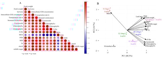 (A) showed the correlation analysis between different indicators (growth indicators, nutritional indicators, photosynthetic indicators, and physiological indicators); (B) The results of principal component analysis (PCA) showed the comprehensive effects of different S−nZVI treatments on the physiological and photosynthetic parameters of Chinese cabbage leaves. Note: *, **, in the figure indicate p ≤ 0.05, p ≤ 0.01, respectively.
