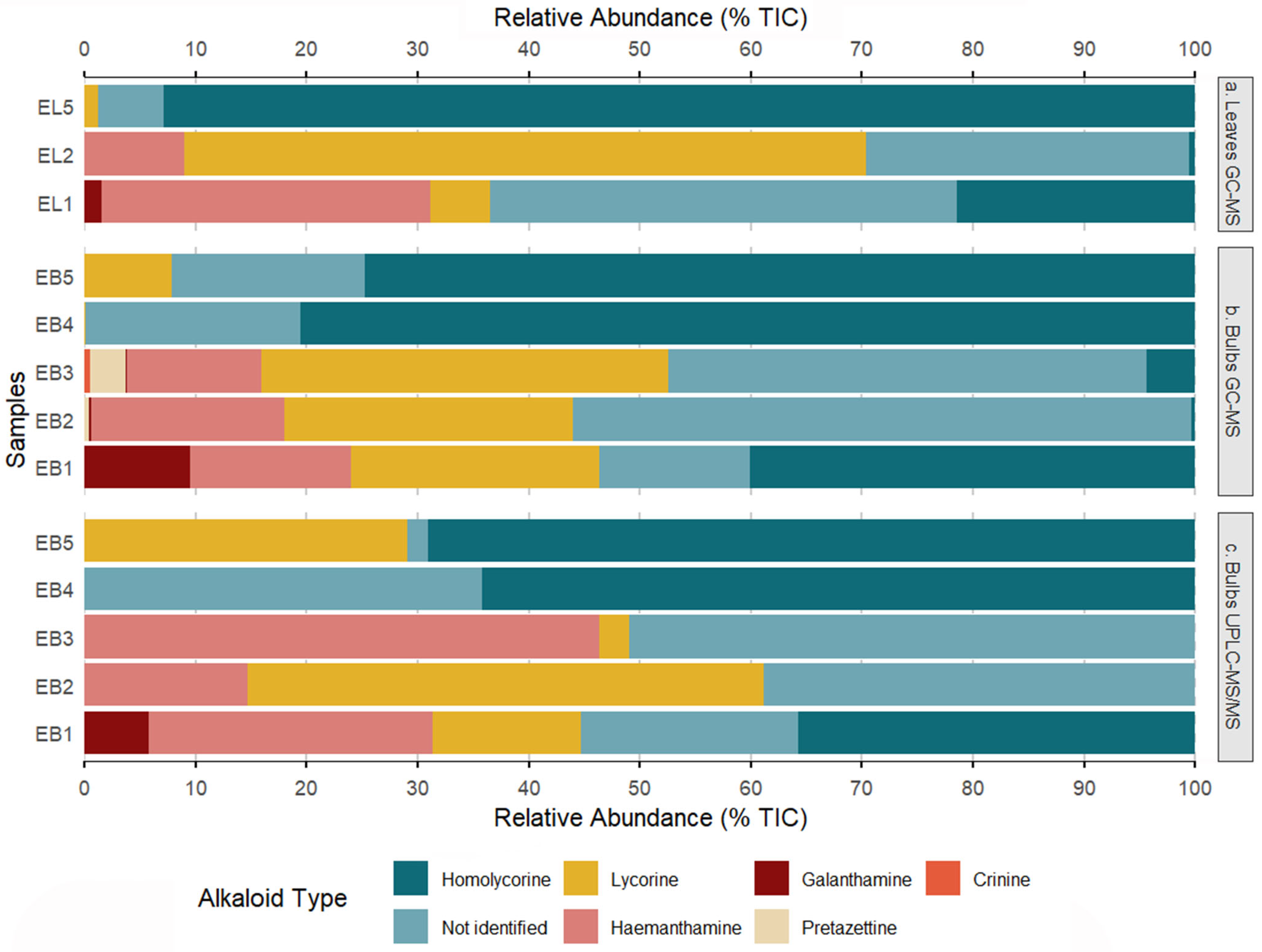 | E. coccinea | Taray—Cusco | Bulb and Leaves | EB1, EL1 | Vegetative (March) | 3 332 |