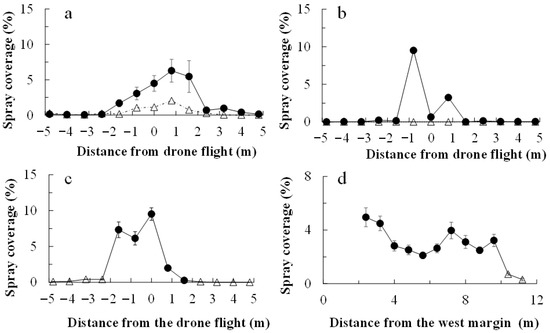 Chlorantraniliprole (a–c) and cyantraniliprole (d) droplet distribution following drone application. Droplets were detected on water-sensitive papers laid across the drone flight swath (0 m) in the drone application area of a sweet potato field. Chlorantraniliprole was applied on 21 August 2019 (a), 16 October (b), and 27 October (c) 2020, and cyantraniliprole was applied on 28 October 2020 (d). For chlorantraniliprole application, the drone flew along the 0 m path, with the swath extending on both sides of the flight path. For cyantraniliprole, it flew along lines located 0, 4, and 8 m from the western margin. The open triangles and closed circles represent papers placed off and within the drone swath, respectively.