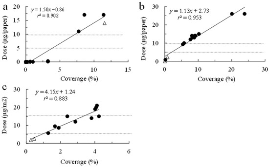 Quantities of insecticide deposited on the water-sensitive paper by drone for chlorantraniliprole on 16 October 2020 (a) and 27 October 2020 (b) and cyantraniliprole on 28 October 2020 (c). Open triangles and closed circles correspond to papers placed off and within the drone swath, respectively. Broken lines represent lower and upper limits of the registered insecticide quantities in Japan: 4.94 to 9.88 µg for chlorantraniliprole and 7.62 and 15.26 µg for cyantraniliprole.