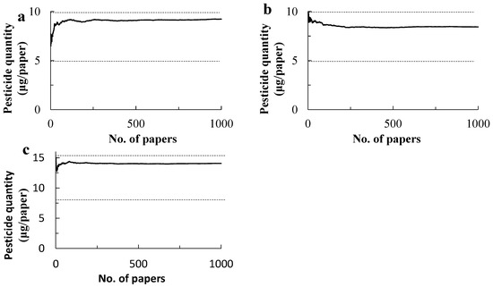 The repeated collection of papers by bootstrapping methods showed that the per paper dose of chlorantraniliprole was asymptotically close to about 9 µg when the collection reached 150 to 200 papers, being within the registered quantity for the paper sizes from 4.94 to 9.88 µg (Figure 4). The papers amount to a 0.30 m2 and 0.40 m2 area, respectively, in both applications. In turn, the size makes a square of 0.54 to 0.63 cm in length or a circle with a 0.61 to 0.71 m diameter. Likewise, in the bootstrapping of cyantraniliprole, the per paper dose varied minimally after the collection of 150 to 200 papers, asymptotically reaching 14.7 µg, which was between the registered dose of 7.62 and 15.26, and again the area size for even distribution was estimated to be from 0.30 to 0.40 m2.