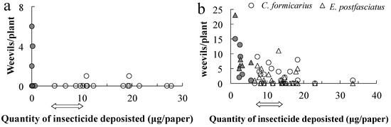 The number of weevils detected in sweet potato plants beside water-sensitive papers in the chlorantraniliprole application in 2020 (a) and the cyantraniliprole application in 2020 (b). Closed marks indicate the plants off the swath. The two-sided arrows indicate the government-stipulated range of insecticide quantities.