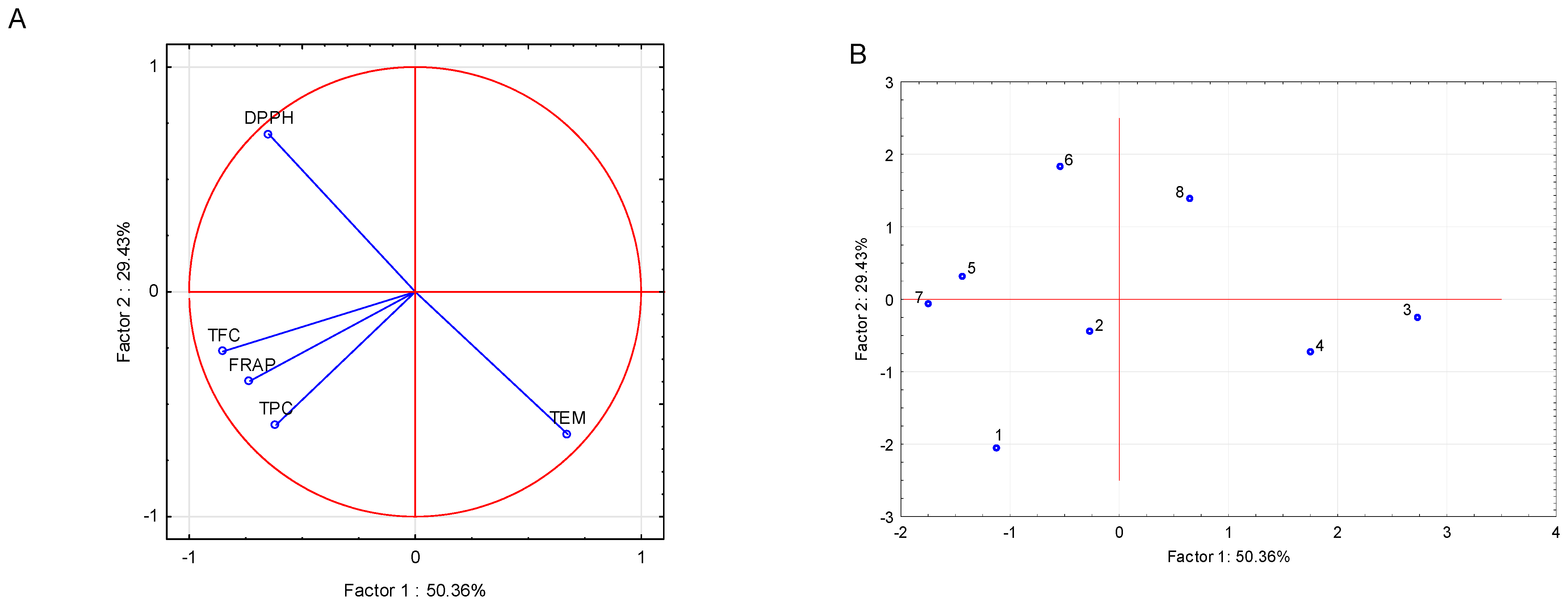 Figure 1A). Factor 1, which explains 50.36% of the total variance, is strongly defined by negative loadings for flavonoid content (TFC, −0.8527), FRAP (−0.7322), total phenolic content (TPC, −0.6158), and DPPH EC