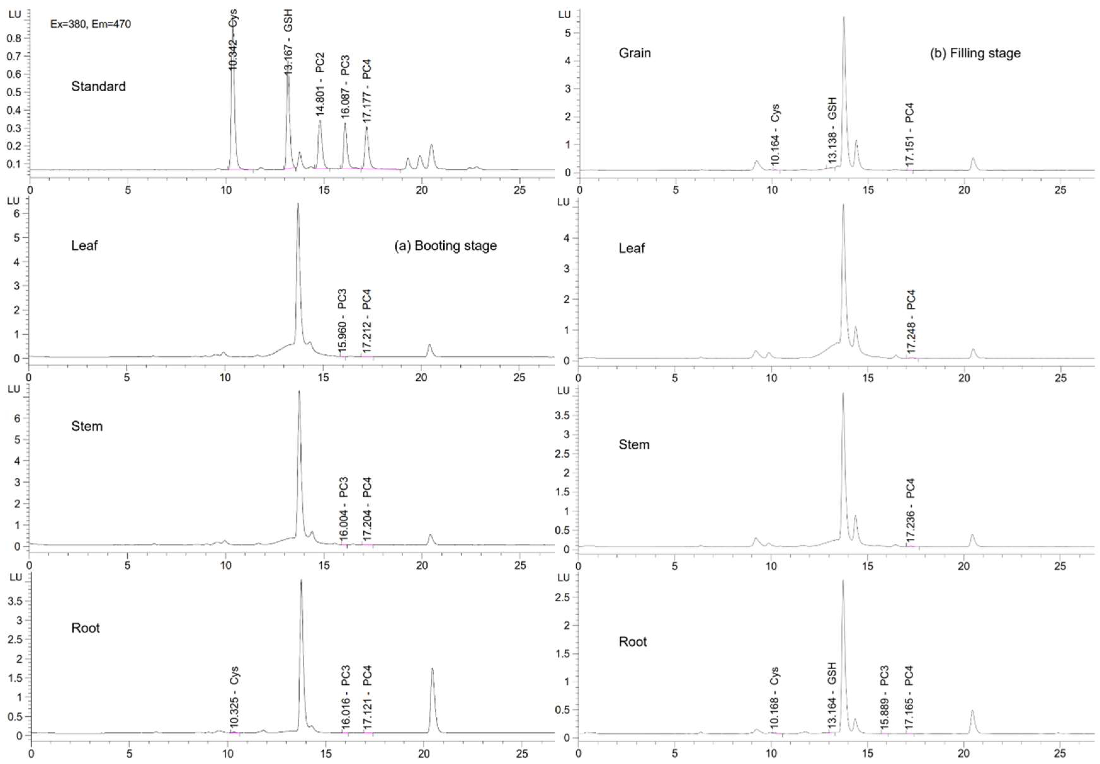 - Ju, X.H.; Tang, S.R.; Jia, Y.; Guo, J.K.; Ding, Y.; Song, Z.G.; Zhao, Y. Determination and characterization of cysteine, glutathione and phytochelatins (PC2–6) in Lolium perenne L. exposed to Cd stress under ambient and elevated carbon dioxide using HPLC with fluorescence detection. J. Chromatogr. B 2011, 879, 1717–1724. [Google Scholar] [CrossRef] [PubMed]